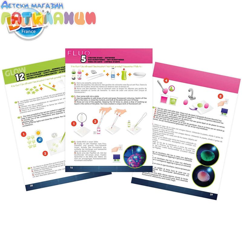 Комплект за извършване на 15 дейности в тъмното за откриване на флуоресцентни цветове и фосфоресциращи предмети.