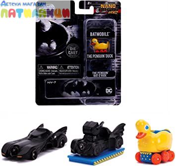 Комплект 3 метални автомобила Nano Batman 1:87 Jada Toys 253211000 Jada Toys, Inc. е американски производител на колекционерски модели под формата на леярски модели , фигурки и радиоуправляеми превозни средства. Основана е през 1999 г. от Джак и Мей Ли.Продуктите на Jada са насочени предимно към колекционерския пазар и са достъпни и популярни в търговските обекти по целия свят.