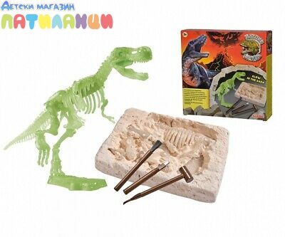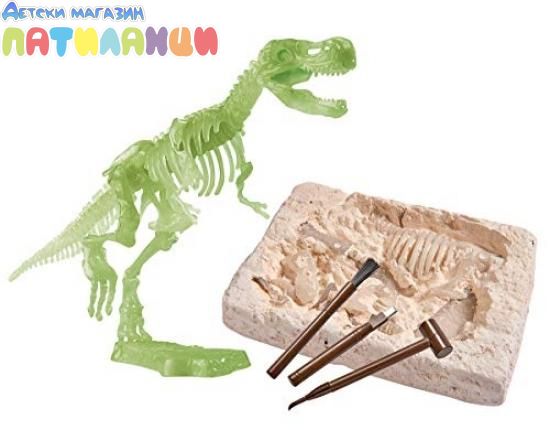 - Светещ в тъмното T-Rex скелет за копаене и свързване заедно, включени инструменти.