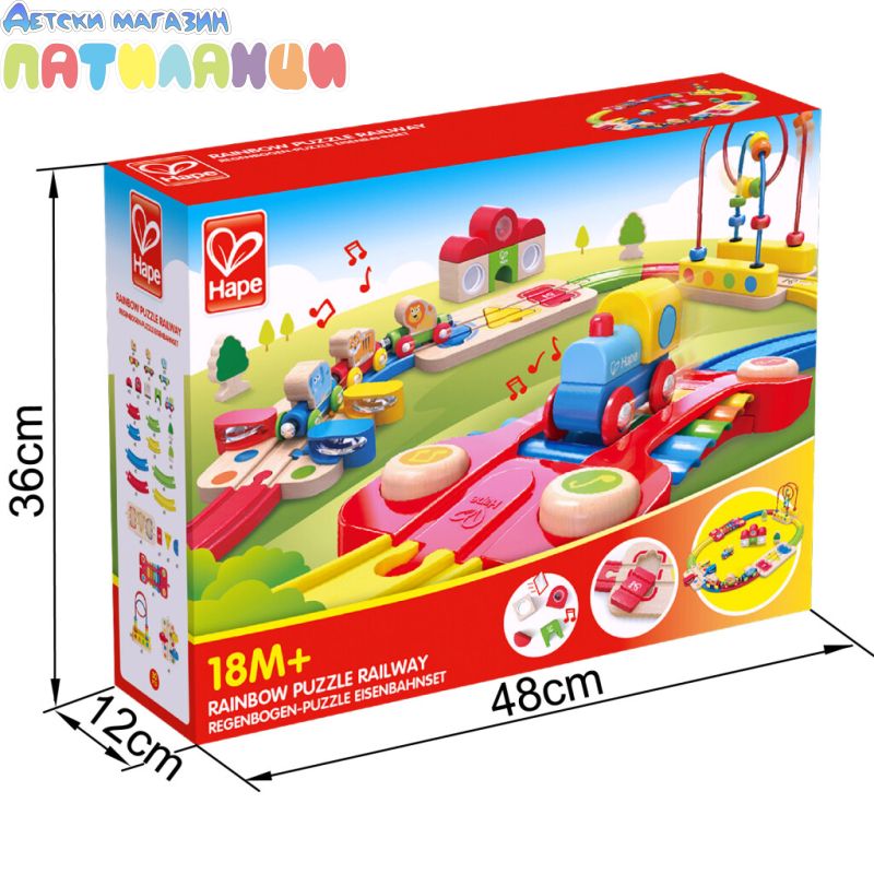 С влаковия комплект Rainbow на Hape игрите са толкова забавни! Цветни дървени релси, лабиринт с мъниста, ксилофон и тамбурина, са само част от елементите включени в комплекта. Музикалните ефекти по време на пътуването с влакчето с животни ще направи лицата на децата наистина сияещи.