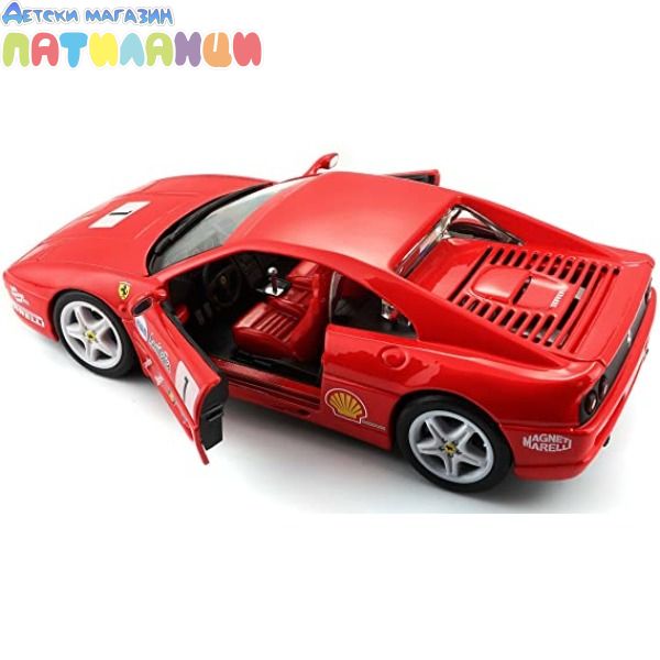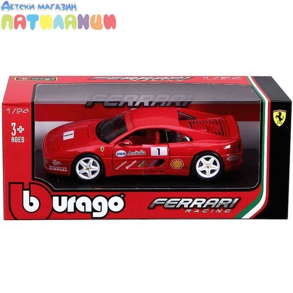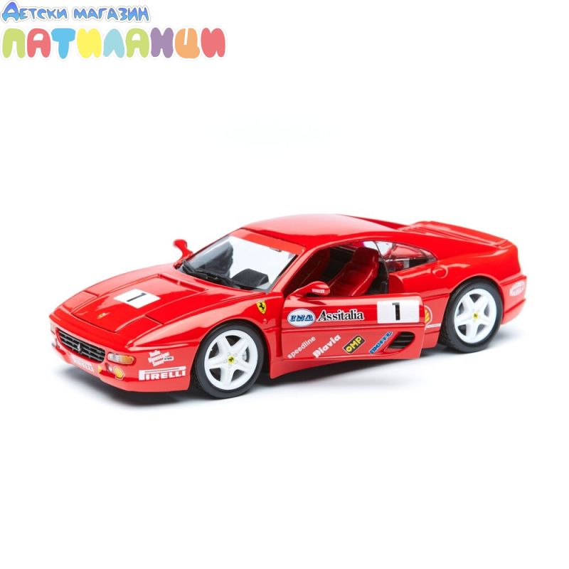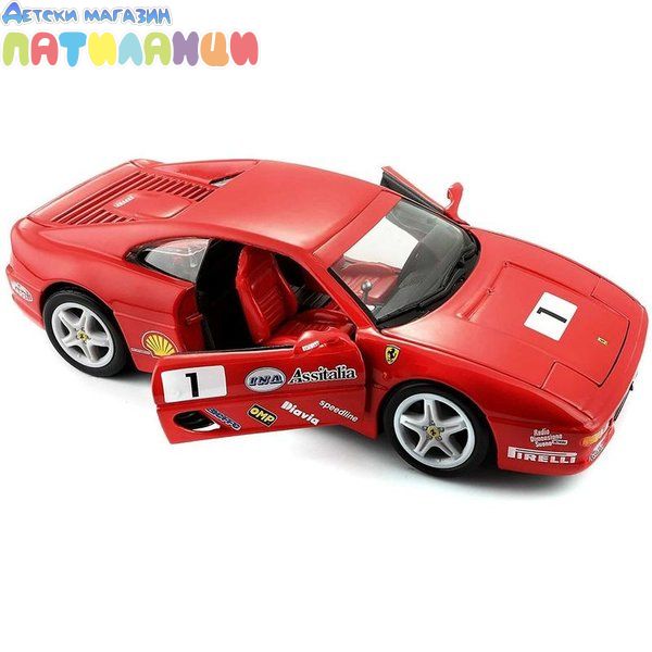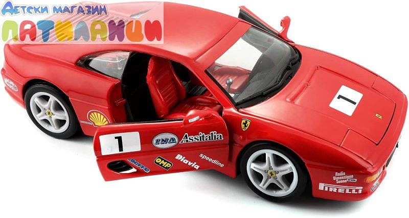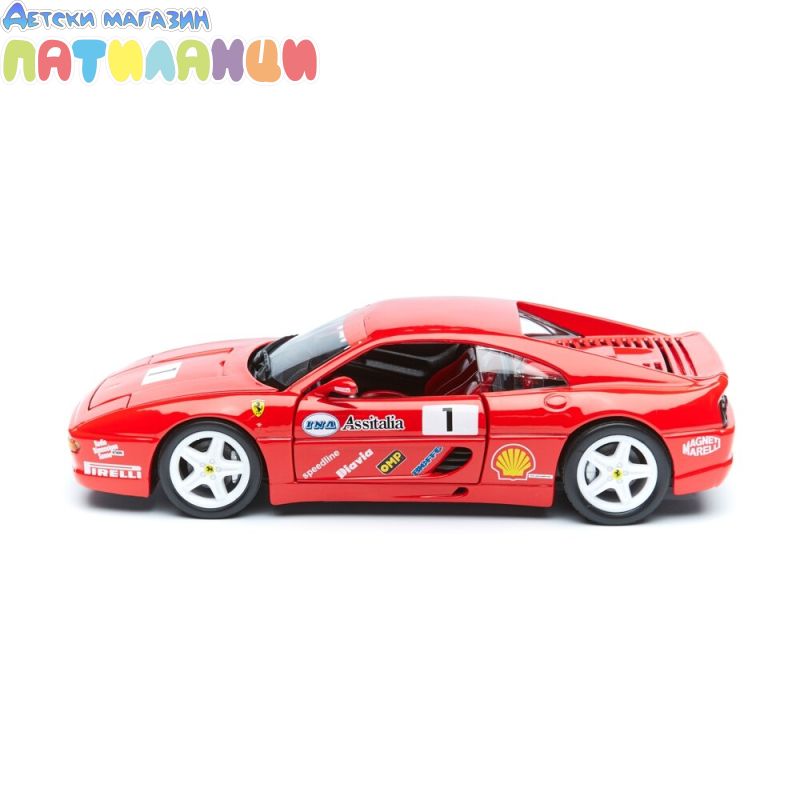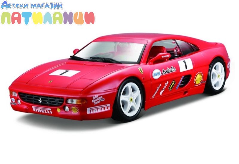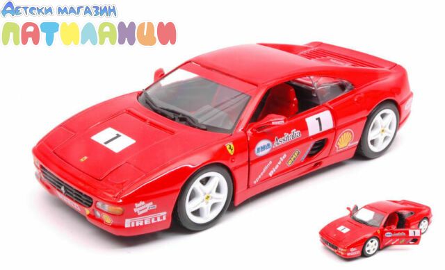 Метална кола Ferrari F355 Challenge Bburago 1:24 ,18/26306.Едва ли има сериозен любител на die-cast количките, който да не разпознава името „Bburago”. Днес това е един от водещите производители на висококачествени метални реплики на някои от най-популярните и грабващи окото модели автомобили. Модерни, класически, спортни, представителни, изискани – умалените копия пресъздават в детайли дизайнът на оригиналите и впечатляват с достоверност и прецизност. Мащаб: 1/24 Възможни са цветови вариации. Доставка според наличностите. Подходящо за деца над 3 години