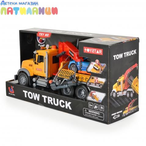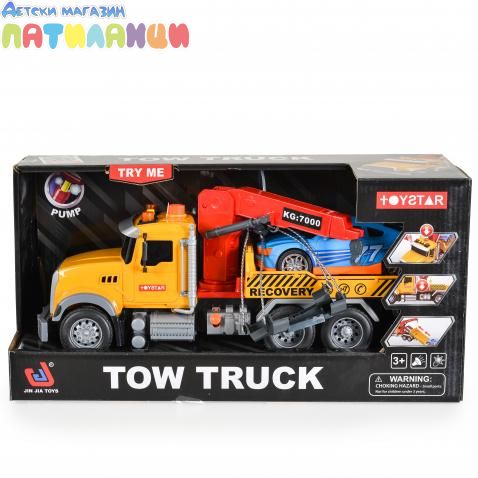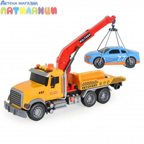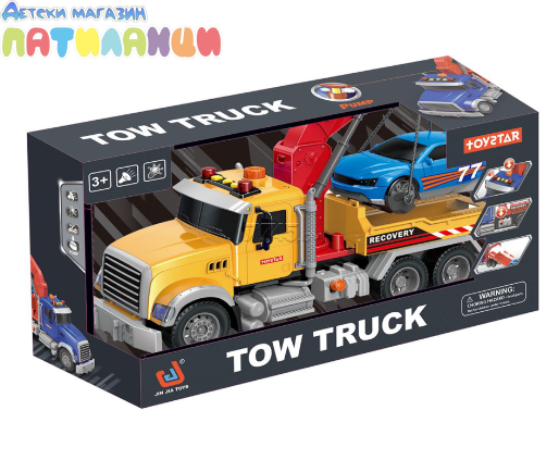 Камион пътна помощ ще бъде чудесен подарък за млад автомобилен ентусиаст. Характеристики на модела: повдигащ манипулатор, подвижна платформа, звукови ефекти (сирена, звук на работещ двигател), светлинни ефекти. Тегличът е оборудван с инерционен двигател, пътува без батерии, трябва само леко да го дръпнете назад и да го освободите. Благодарение на инерционния механизъм теглещият камион може бързо да ускори до висока скорост за кратък период от време. Комплектът включва играчка кола. Размер на теглича: 36.6x23.4x37.9 см. Захранване: 3 батерии AG13 (включени).