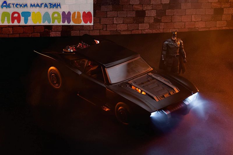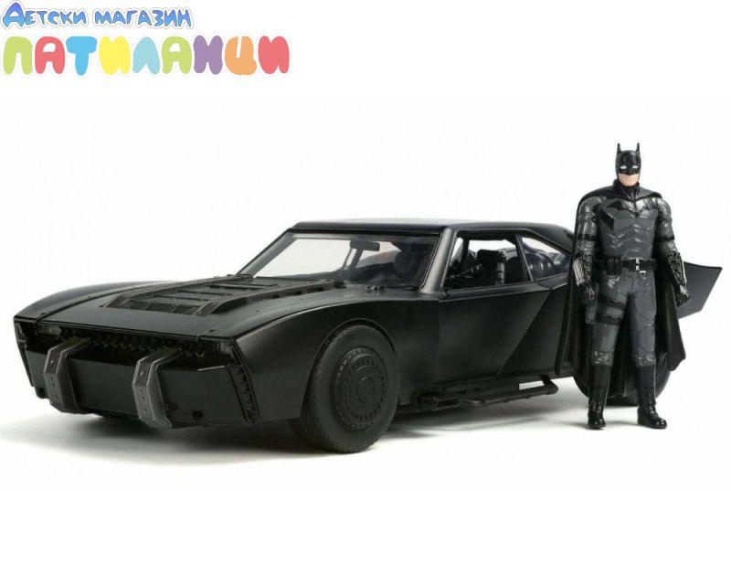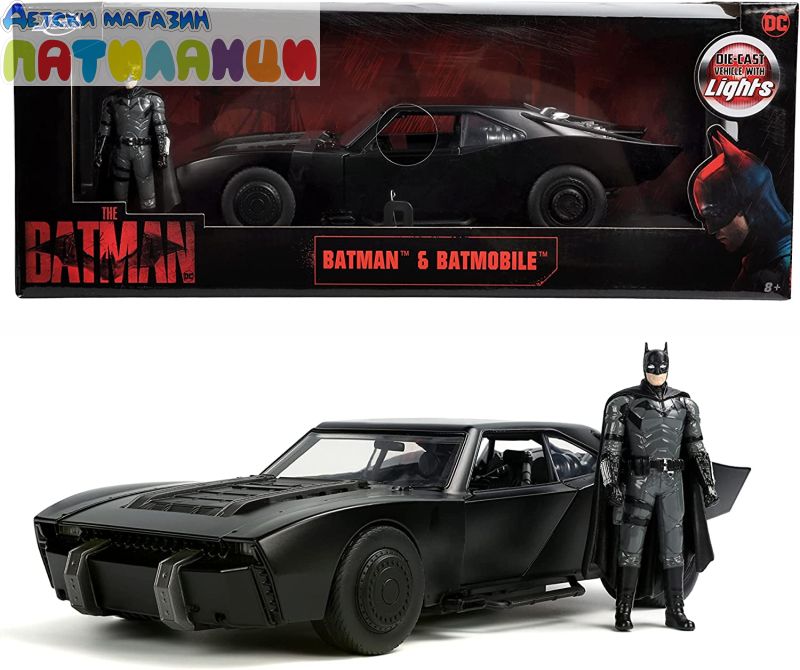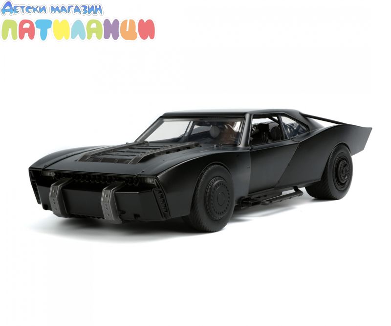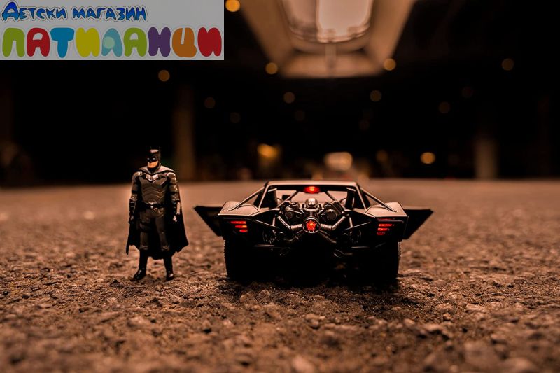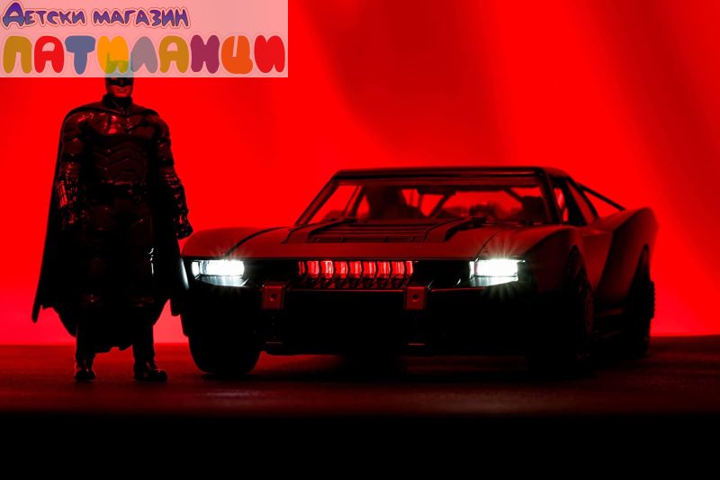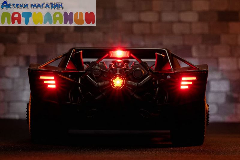 Jada Toys The Batman - Батмобил метална кола. Колекционерска реплика в мащаб 1:18 с метална фигура, свободен ход, предни и задни светлини и отварящи се врати.Изработена от лят метал с гумени гуми.