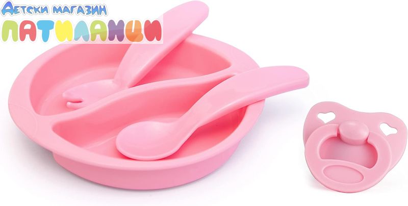 Комплектът включва и прибори за хранене на кукла - купичка, вилица и лъжица, биберон.
