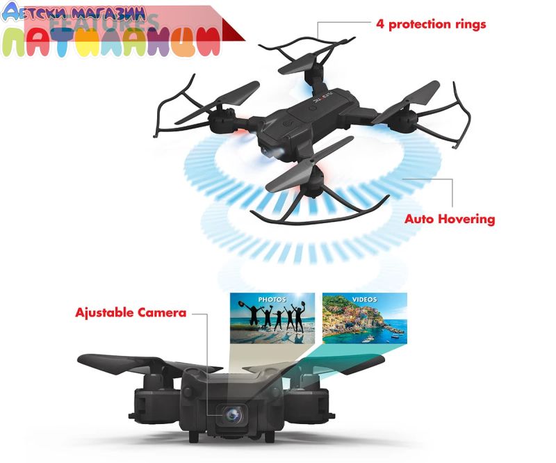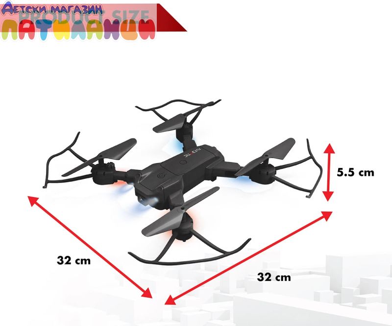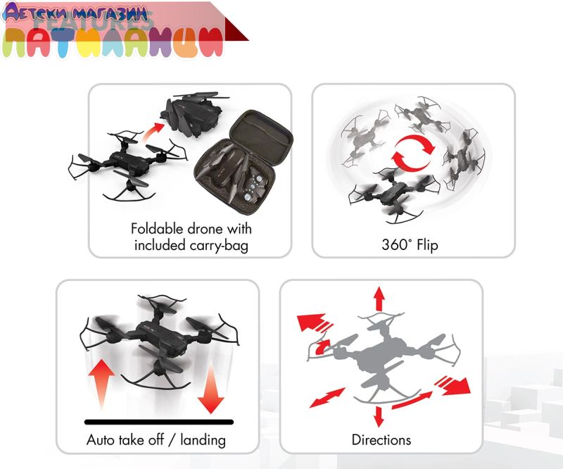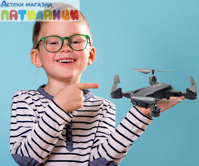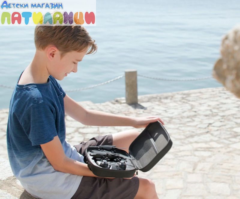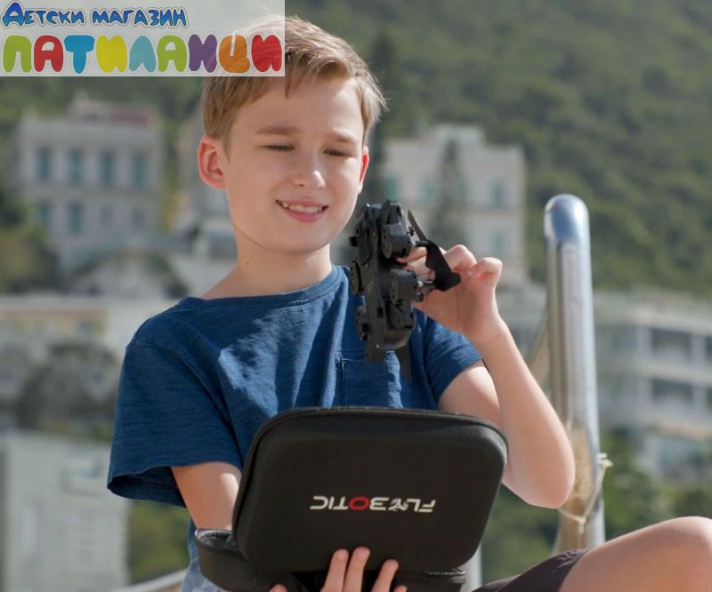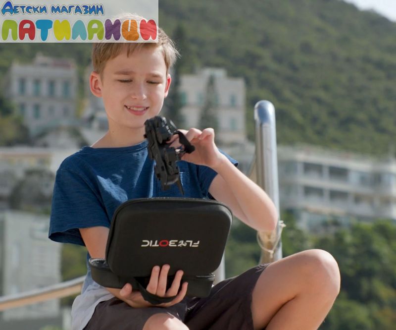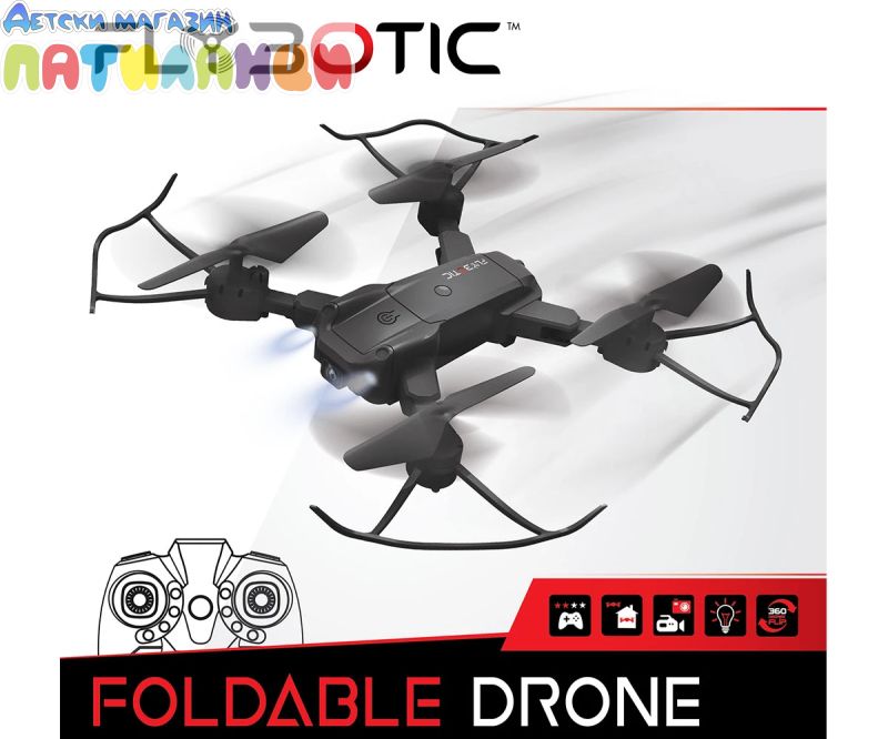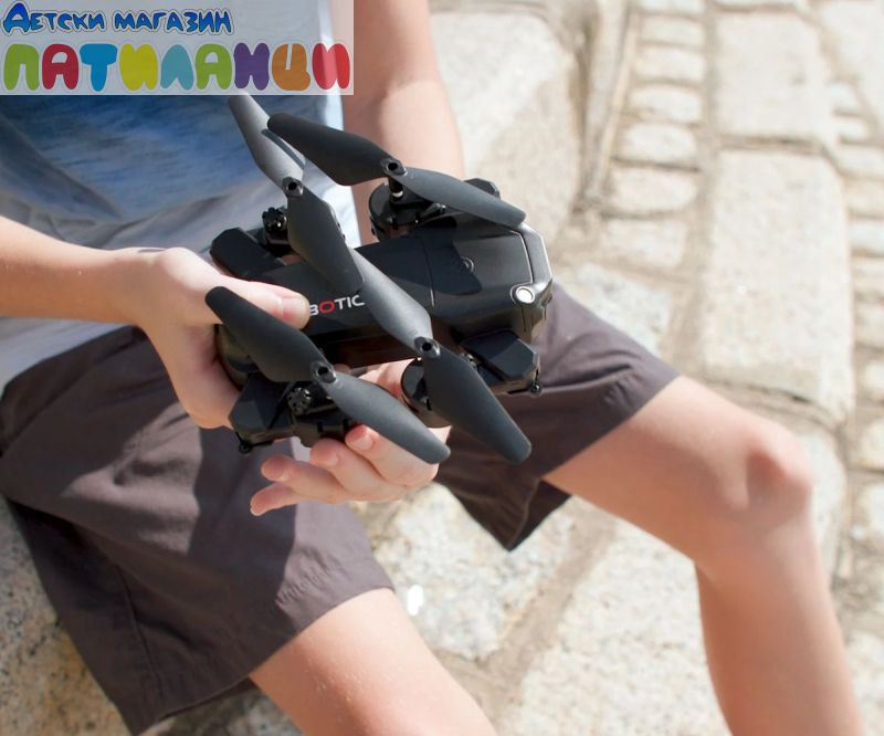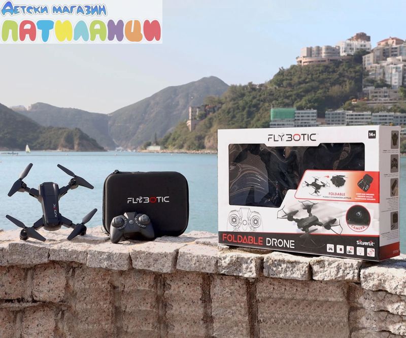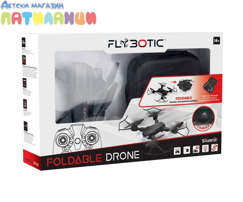 Сгъваем дрон FLYBOTIC. Сгъваемият дрон с 33 мм камера. Дрон, който можете да носите навсякъде! С камера от 480 пиксела, той е идеален за невероятни снимки. Благодарение на плаващия полет, той е лесен за управление и се побира във всяка ръка. Светлинни ефекти и 2.4GHz технология за използване на открито. Заредете батерията чрез USB кабел (включен). За деца на 14 и повече години.