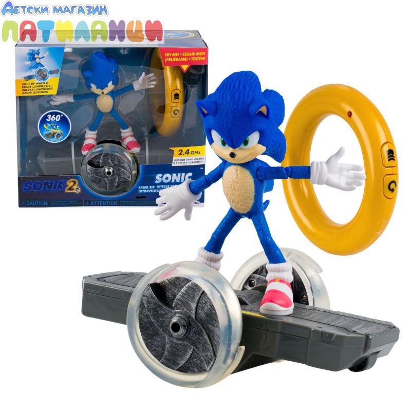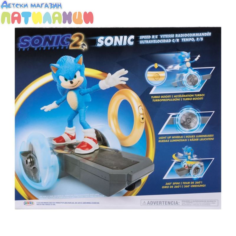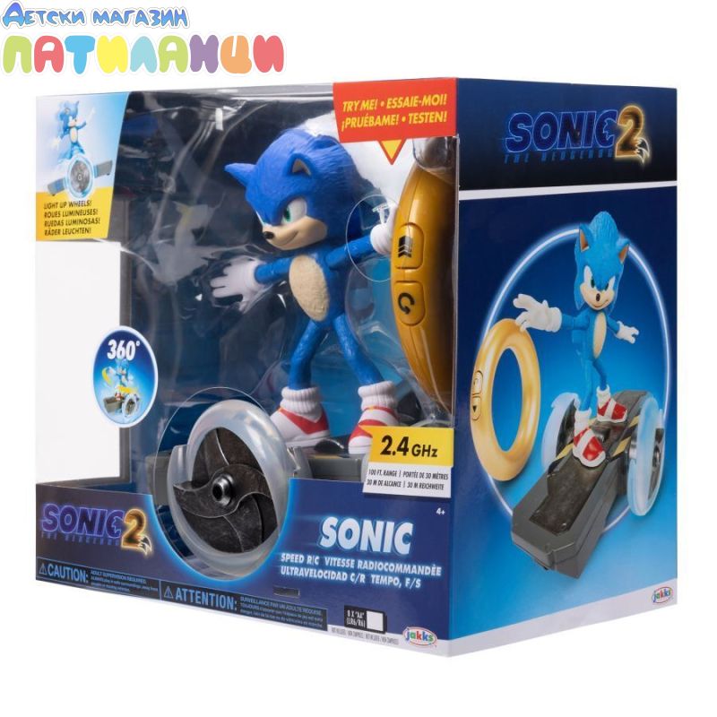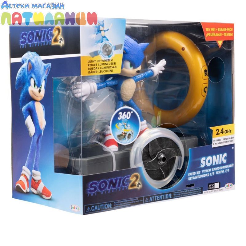 Любимият син таралеж в света се завръща за приключение от следващо ниво в Sonic the Hedgehog 2. След като се установява в Green Hills, Sonic е нетърпелив да докаже, че притежава всичко необходимо, за да бъде истински герой. Колко бързо можете да карате със Sonic Speed R/C? Пресъздайте действието от филма Sonic the Hedgehog 2, докато Sonic се състезава, за да спаси света и да се изправи срещу Robotnik! Този R/C включва 6-инчова демонтируема Sonic фигура, R/C ездач и пръстен контролер. Контролерът е вдъхновен от пръстените на Sonic от филма и има 3 бутона за пълен контрол: движение напред, завъртане и завъртане на 360 градуса, както и Turbo режим, който осветява колелата за този допълнителен тласък! Sonic Speed R/C е в мащаб приблизително 1:5 с дизайн, вдъхновен от филма. Подвижната фигура на Sonic е над 6 инча висока и има 13 точки на артикулация за страхотни пози. Вземете вашия R/C и се забавлявайте в движение! Този R/C изисква 8 AA батерии (продават се отделно). Има обхват от 100 фута и работи най-добре на плоски и гладки повърхности. Използва честота от 2,4 GHz. Изисква се наблюдение от възрастен. Някои деца ще имат нужда от помощ при сглобяването.