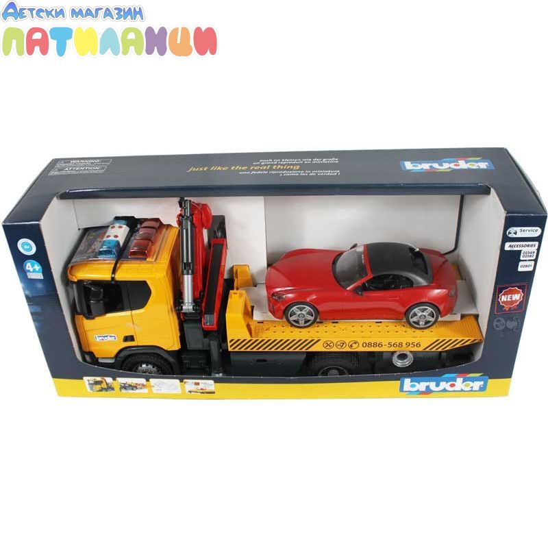 Камион паяк с платформа Scania Super 560R с кола Роудстър Bruder 03552