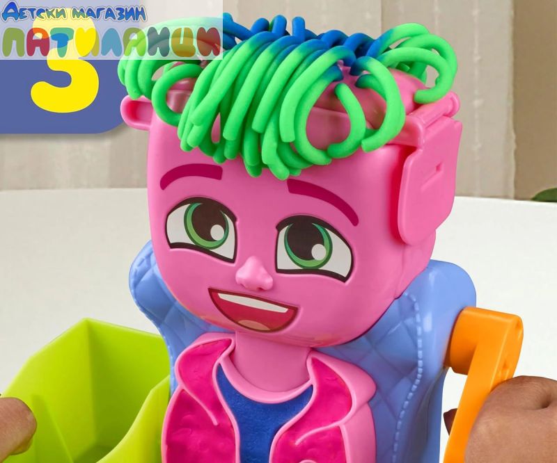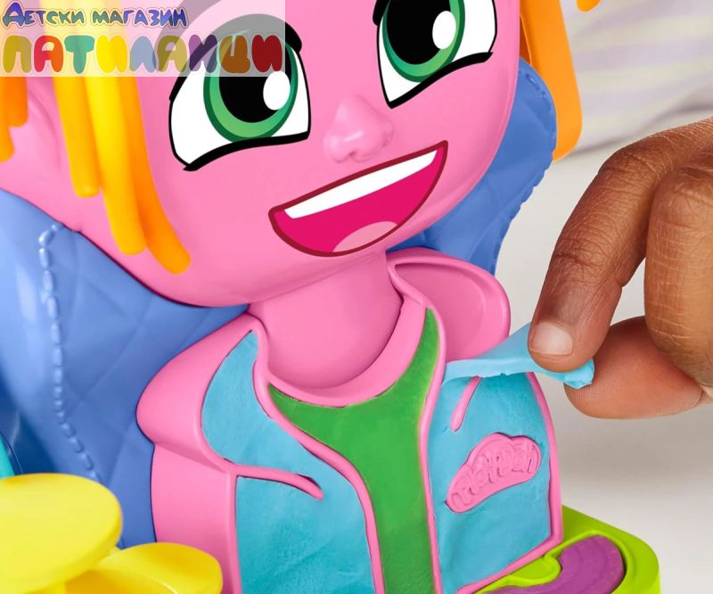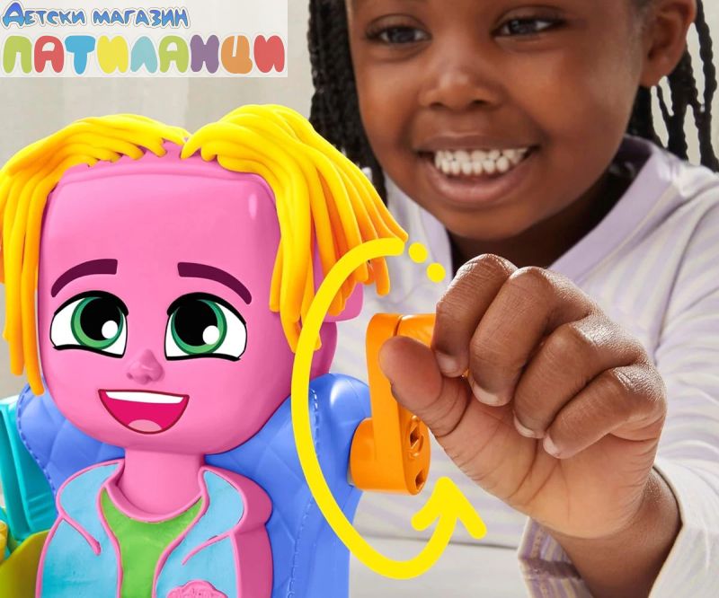 Децата могат да създават щури, цветни прически Play-Doh с този комплект за игра фризьорски салон за момичета и момчета. Сложете малко Play-Doh пластилин, изберете плоча за текстура на косата и завъртете лесната за завъртане дръжка, за да създадете забавни кичури! Искате ли по-дълга коса? Добавете още пластилин за да порасне още по-дълга! Има много инструменти на Play-Doh, за да изживеете момента във фризьорския салон! Подстрижете косата до произволна дължина с ножицата, направете къдрици със сешоара или използвайте машата, за да добавите забавна текстура. Използвайте формичките за кок и ирокез и полуформите на основата на комплекта за игра, за да направите допълнителни стилове. Когато времето за игра приключи, приберете инструментите и аксесоарите направо в отделенията на комплекта за игра.