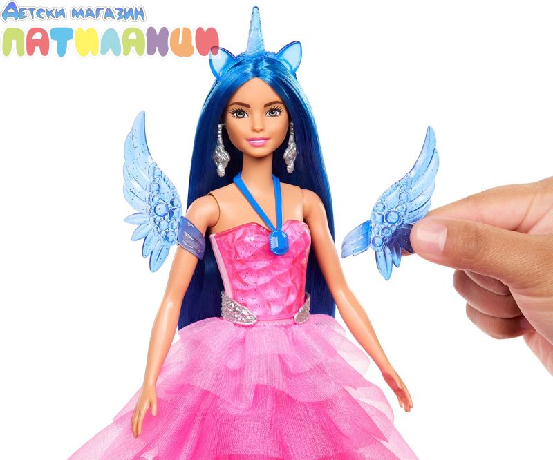 Нейният домашен любимец аликорн има сапфирено синя яка и крила! Децата ще обичат да мечтаят за фантастични приключения с куклата Барби и нейния крилат приятел еднорог;