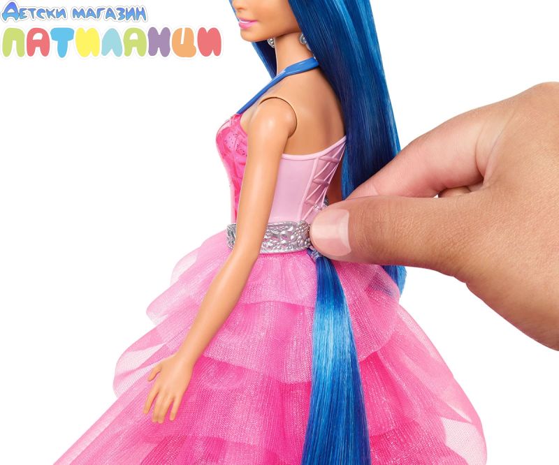 Роклята на куклата Барби се отличава с перлено розов корсаж и пола. Сияещият й външен вид се отличава със сапфирени сини щрихи навсякъде в знак на 65-годишнината на Барби!