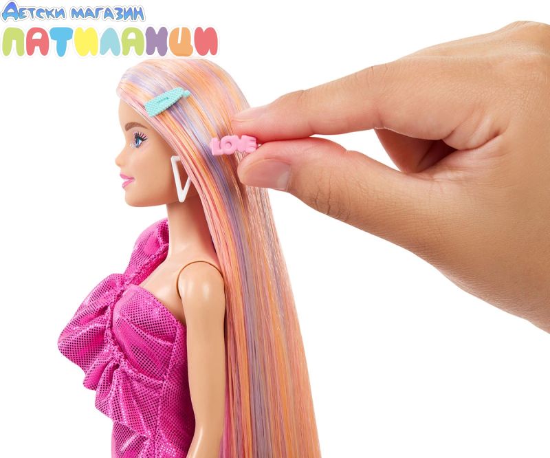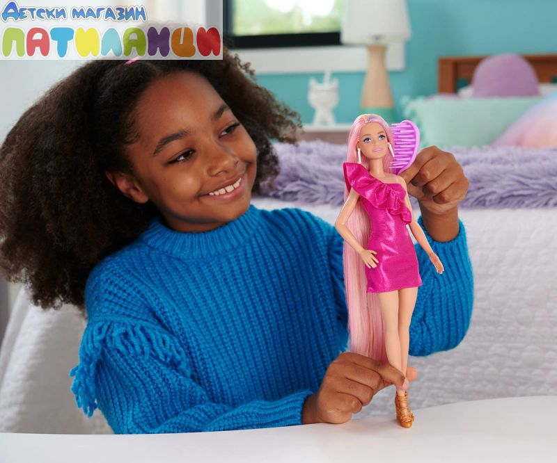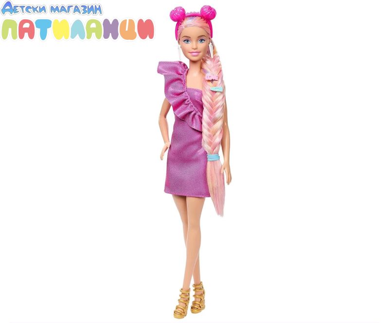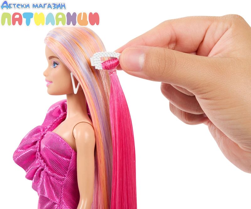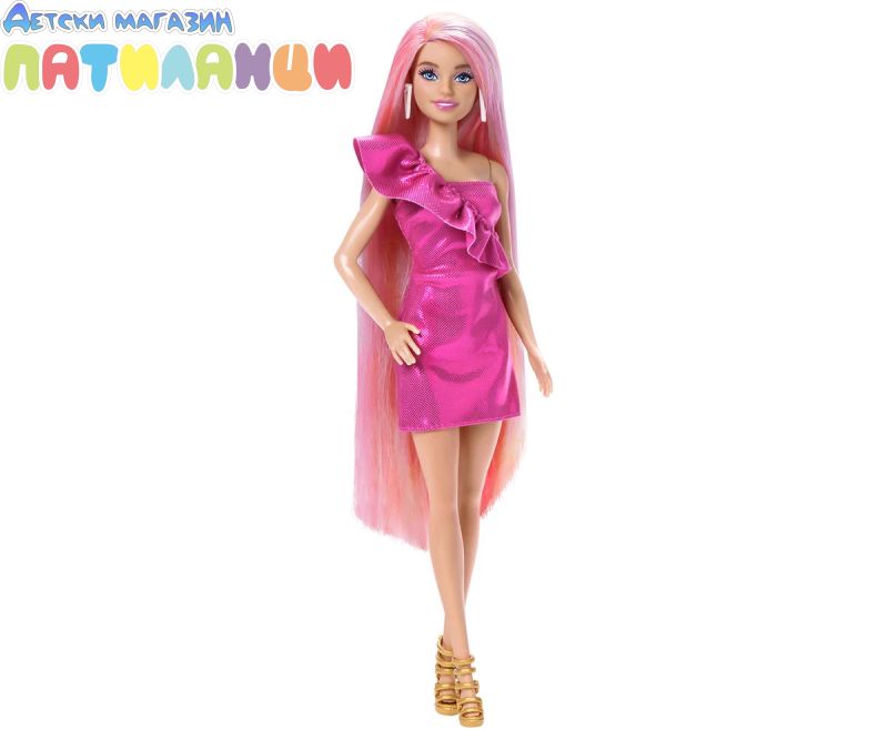 Куклата Barbie® има 21 см изключително дълга руса коса, с фантастичен цвят! Тя носи лъскава розова мини рокля с бели обеци и златни обувки с каишки;