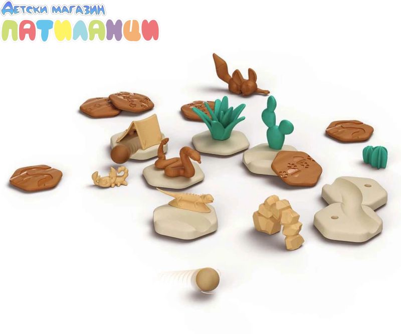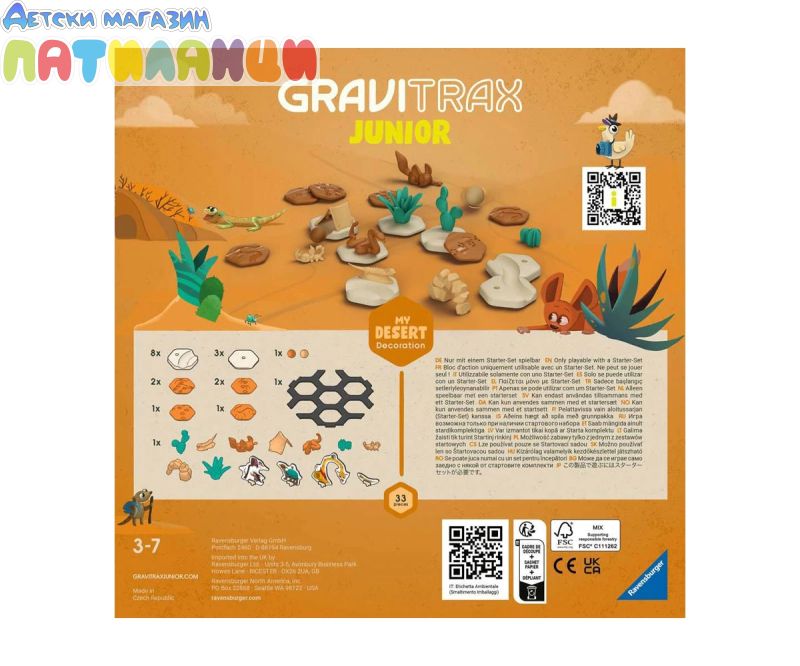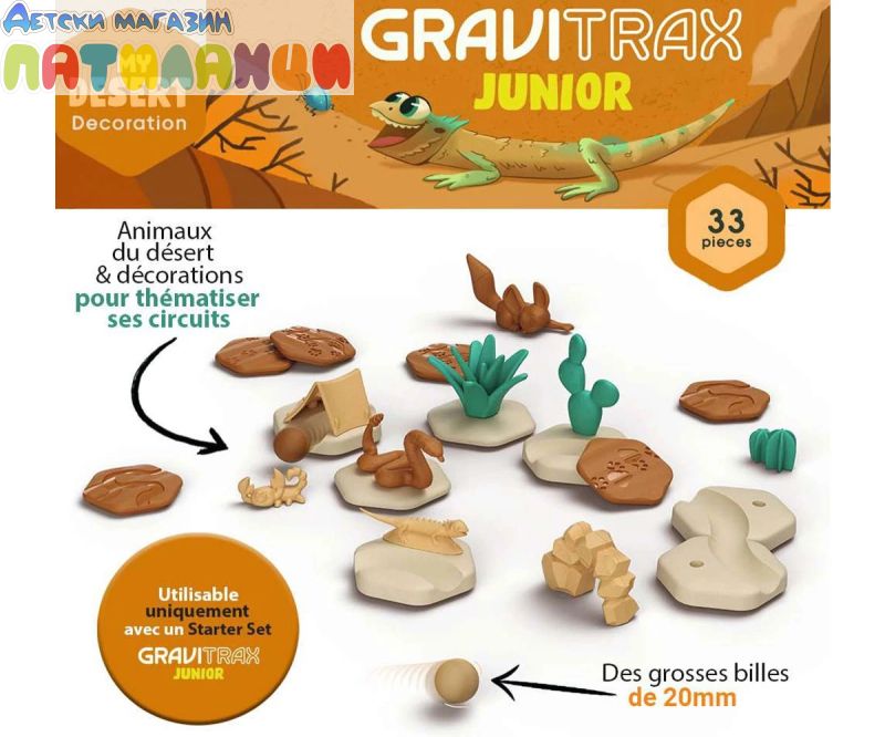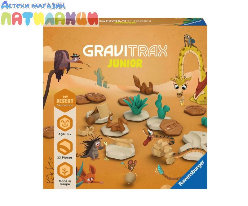 Открийте GraviTrax JUNIOR, строителната гама от 3 години! GraviTrax JUNIOR позволява на деца от 3 години да научат как да изграждат мраморни вериги! Вашето дете тематизира своите вериги и се потапя в един магически и цветен свят на GraviTrax! Гмурнете се в сърцето на пустинята с този комплект за разширяване на пустинята от 33 части! Презареждане за изследване на горещите пясъчни дюни, откриване на пейзажа и пустинните животни! Изградете верига и я модифицирайте: GraviTrax се възстановява безкрайно! Изисква поне един стартов комплект GraviTrax JUNIOR. Частите са предназначени за малки деца с лесно за научаване съдържание. Материалите са предимно от възобновяеми източници, произведени в Европа и изработени от материали с биологичен произход: дървесни влакна и органична пластмаса. GraviTrax JUNIOR насърчава ученето на децата, като стимулира техните двигателни умения и мислене при проектиране на мраморни вериги. Веднъж конструирано, детето също работи върху своите причинно-следствени връзки по време на фазата на игра.