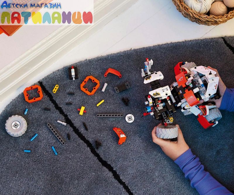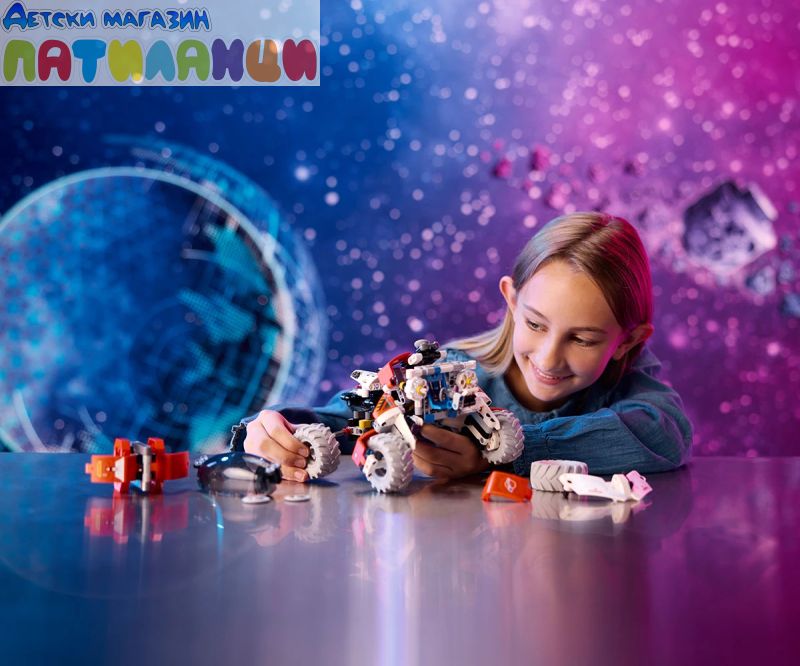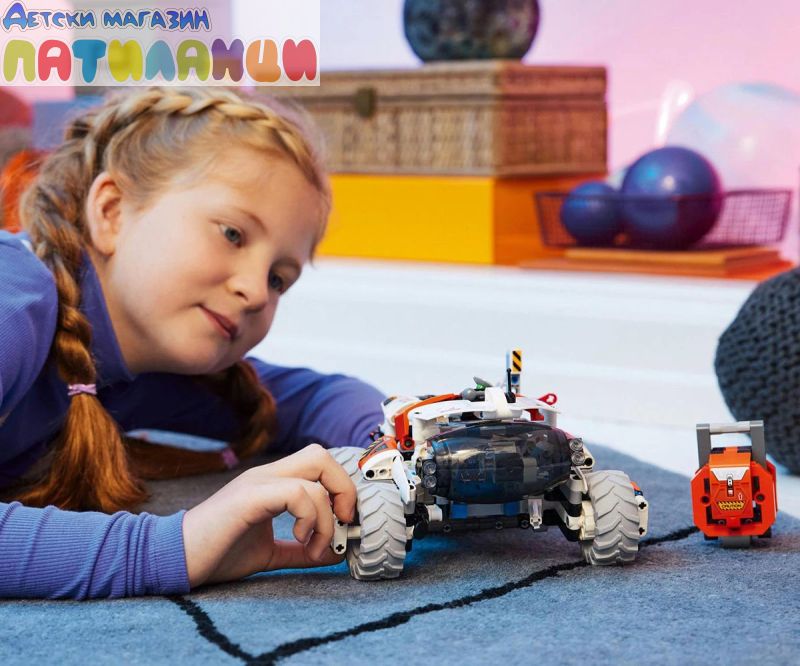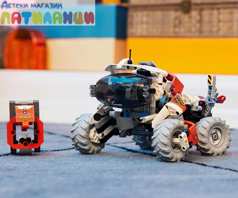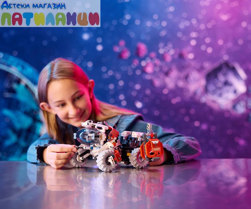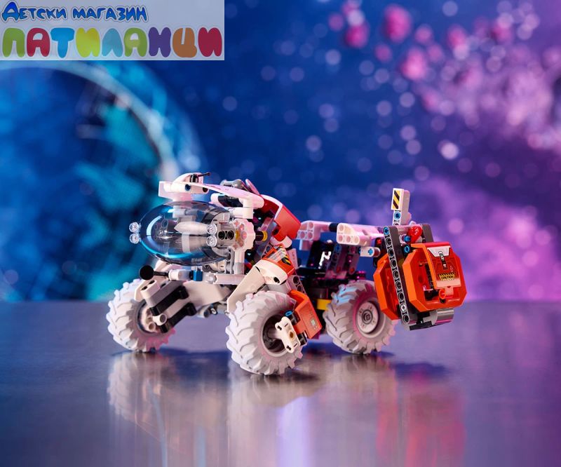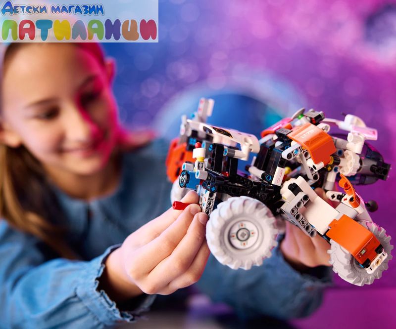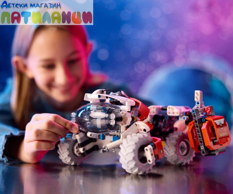 Превозното средство от LEGO® Technic се спуска и повдига, за да се движи по различни повърхности, и е забавен подарък на космическа тематика за деца.