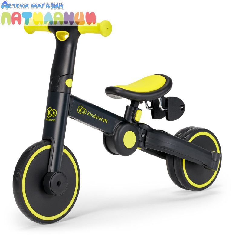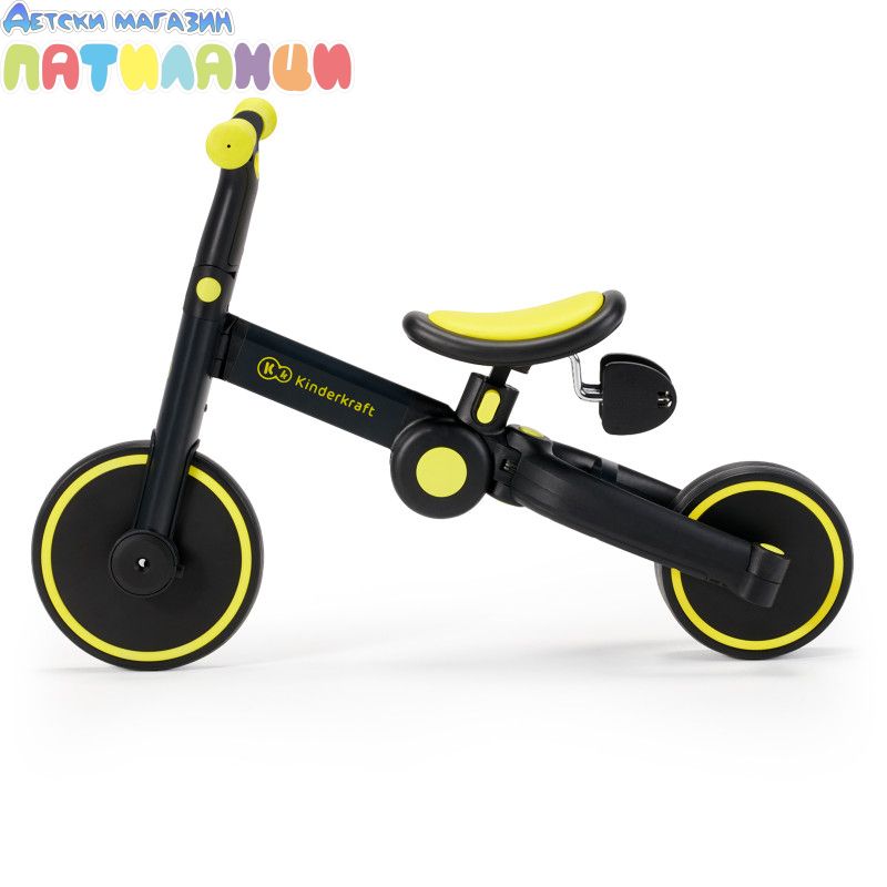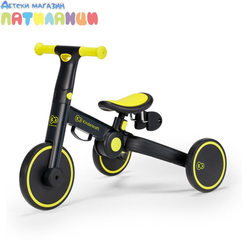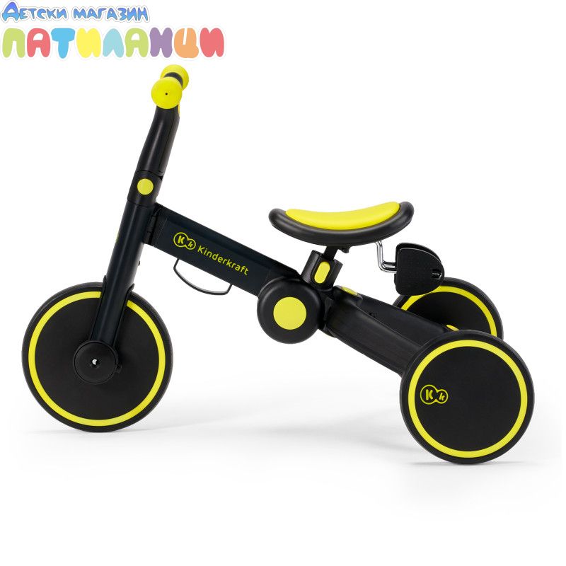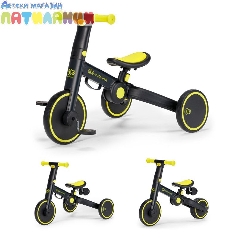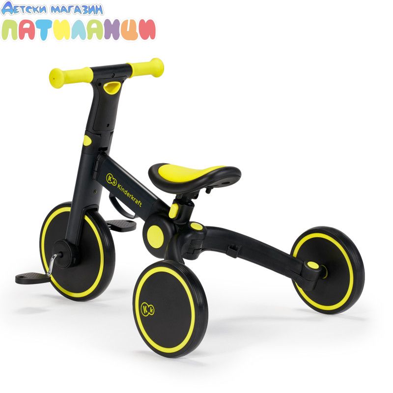 4TRIKE е триколка с педали, която лесно се трансформира в играчка за бутане(ride-on) и мини баланс колело! Този любим 3в1 продукт ще помогне на детето да подобри двигателните си умения, да се научи да балансира и ще го насърчи да започне първите си опити да кара колело. Забавленията заедно навън или у дома ще останат в спомените ви завинаги! 4trike има устойчиви на пробиване гуми от пяна, благодарение на които вашето мъниче ще може да използва колелото както у дома, така и навън. Нямате нужда от никакви инструменти, за да промените функциите - можете да го направите за минута, дори по време на разходка. И когато вашето мъниче се отегчи от карането на триколка, педалите могат лесно да бъдат преместени под седалката, на специално обособено за тях място. 4TRIKE е подходящ за деца от 1 до около 3 годишна възраст. Регулируемата седалка ще ви позволи да регулирате по-добре велосипеда спрямо ръста на детето, а благодарение на лесното му сгъване можете да вземете 4TRIKE навсякъде със себе си- на почивка или дори когато пазарувате, защото ще се побере в пазарската количка.