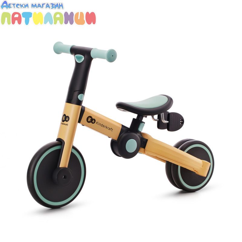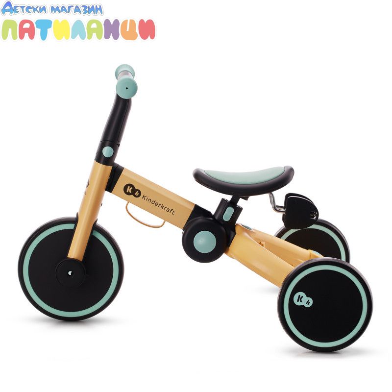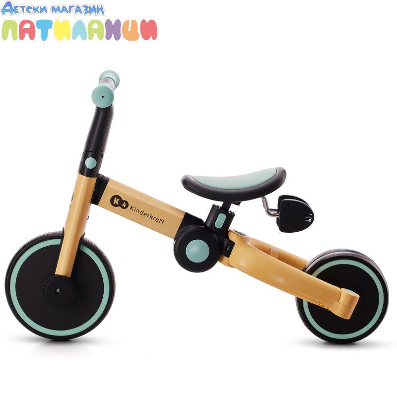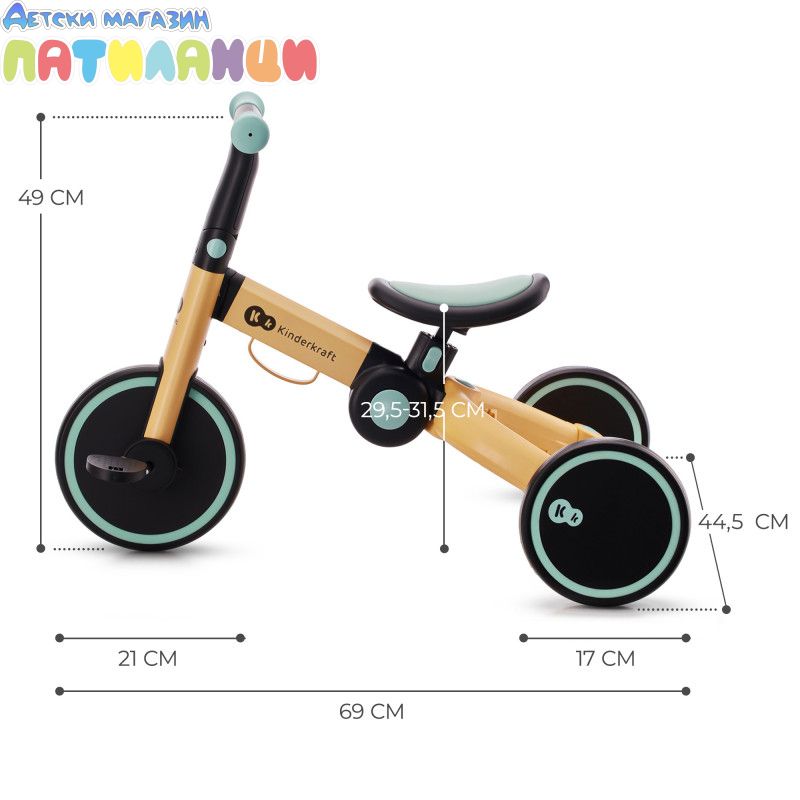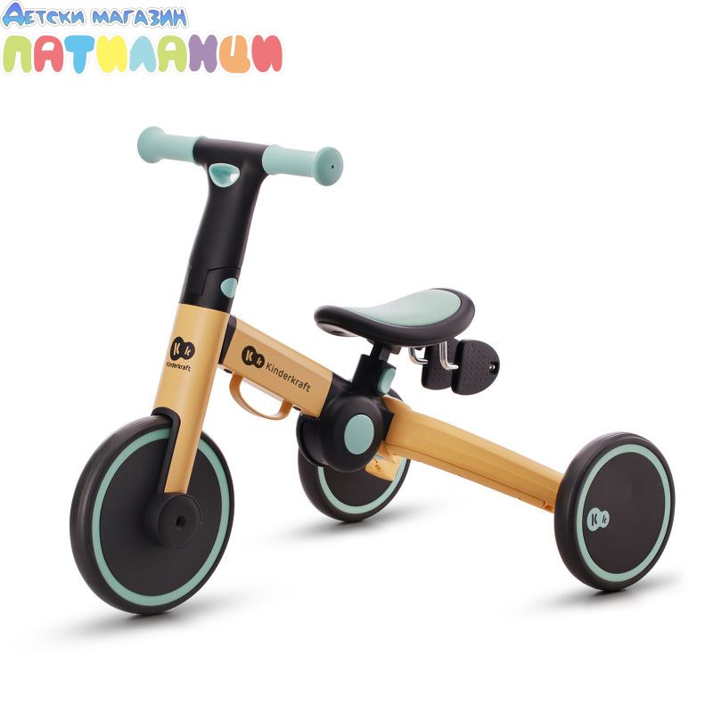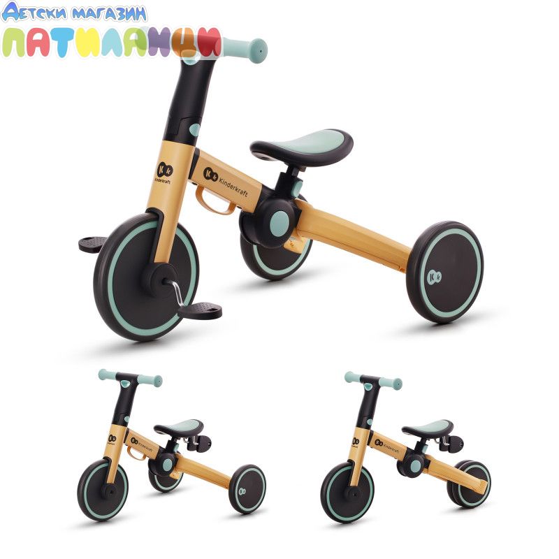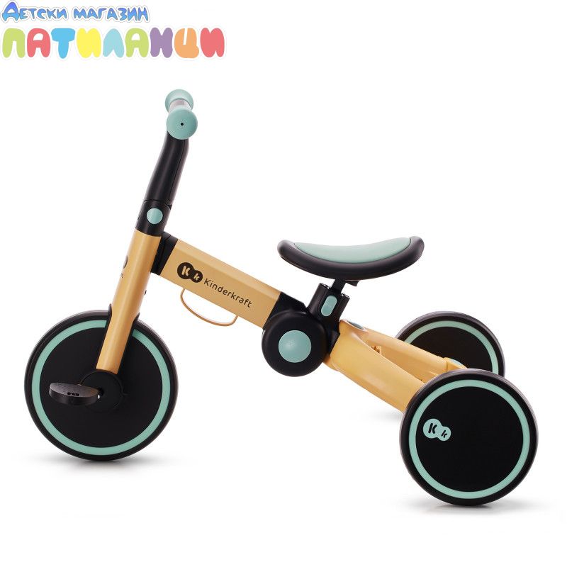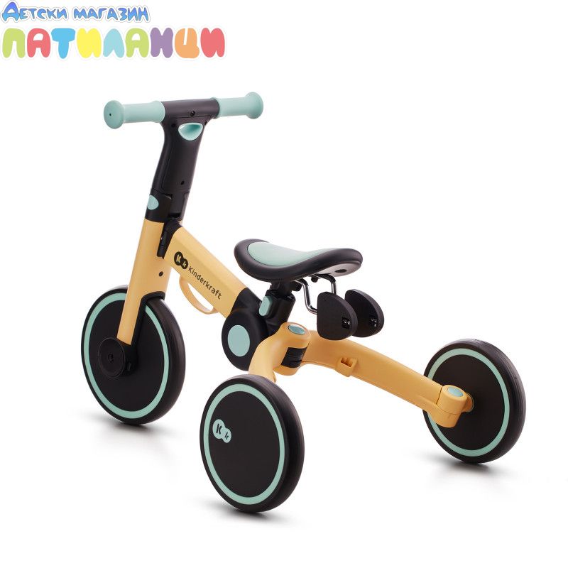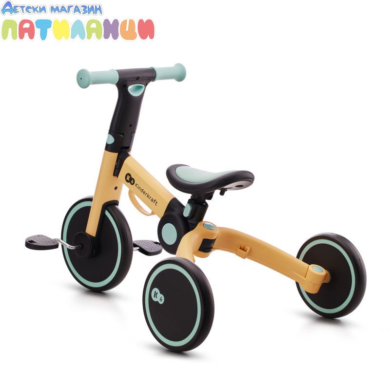 4TRIKE е триколка с педали, която лесно се трансформира в играчка за бутане(ride-on) и мини баланс колело! Този любим 3в1 продукт ще помогне на детето да подобри двигателните си умения, да се научи да балансира и ще го насърчи да започне първите си опити да кара колело. Забавленията заедно навън или у дома ще останат в спомените ви завинаги! 4trike има устойчиви на пробиване гуми от пяна, благодарение на които вашето мъниче ще може да използва колелото както у дома, така и навън. Нямате нужда от никакви инструменти, за да промените функциите - можете да го направите за минута, дори по време на разходка. И когато вашето мъниче се отегчи от карането на триколка, педалите могат лесно да бъдат преместени под седалката, на специално обособено за тях място. 4TRIKE е подходящ за деца от 1 до около 3 годишна възраст. Регулируемата седалка ще ви позволи да регулирате по-добре велосипеда спрямо ръста на детето, а благодарение на лесното му сгъване можете да вземете 4TRIKE навсякъде със себе си- на почивка или дори когато пазарувате, защото ще се побере в пазарската количка.