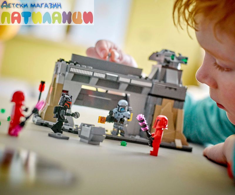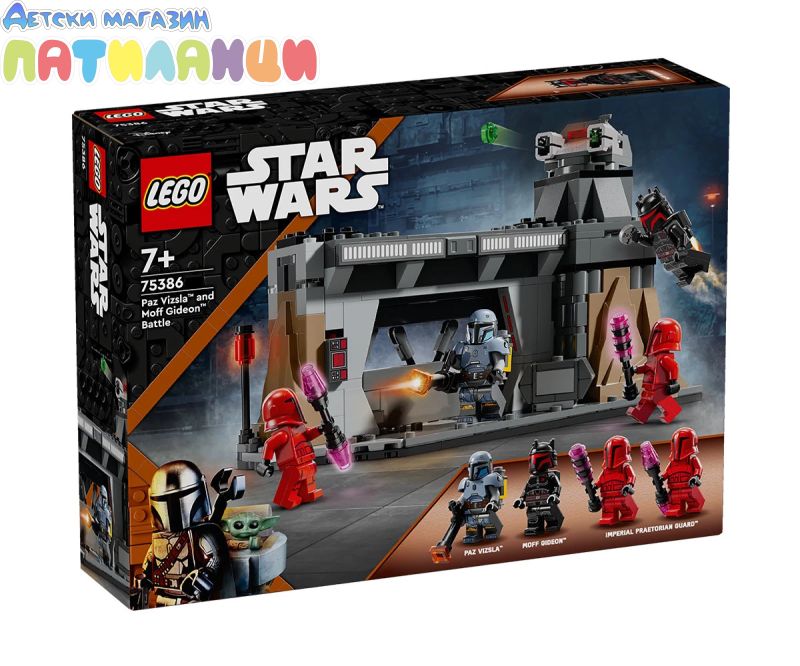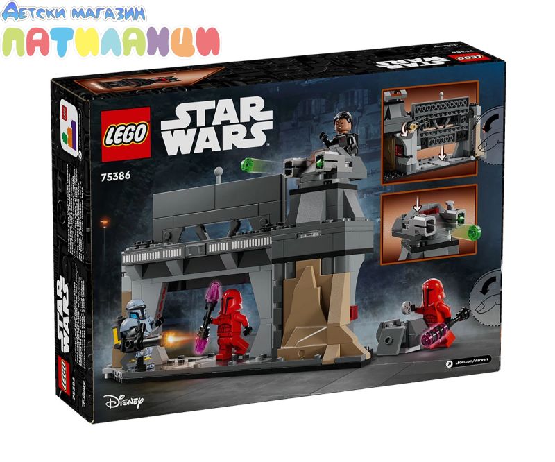 Постройте драматичната епична сцена от сезон 3 на Star Wars: The Mandalorian с този комплект LEGO® Star Wars™ Битка между Паз Висла и Моф Гидиън (75386) за момчета, момичета и всеки фен на възраст 7+. Страхотен фантастичен подарък за деца, този комплект за игра, построен от тухлички LEGO, включва мандалорска база с блиндирана врата със затваряща ръчка, контролни табла и въртяща се стреляща оръдейна кула. Има и 4 колекционерски фигури LEGO Star Wars: The Mandalorian за разиграване на сблъсъка между Паз Висла и Моф Гидиън ( с броня на тъмен щурмовак) с имперски преторианци, плюс аксесоари като реактивната раница на Моф Гидиън и кутия с топлинен детонатор за творческа игра. Вдъхновете строителното приключение на децата с приложението LEGOBuilder, в което те могат да мащабират и завъртат 3D модели на конструкциите, да запазват комплекти и да проследяват напредъка си. Мандалорската база може да бъде свързана със скалната конструкция/пещера в бойния пакет 75373 Засада на Мандалор, продава н отделно, за допълнителни възможности за игра.