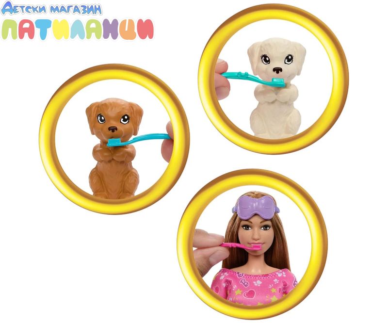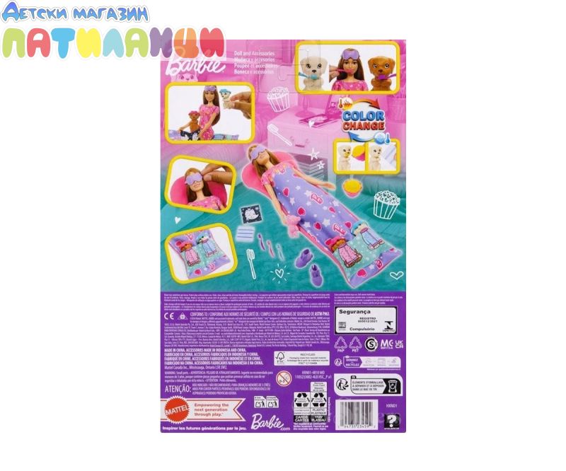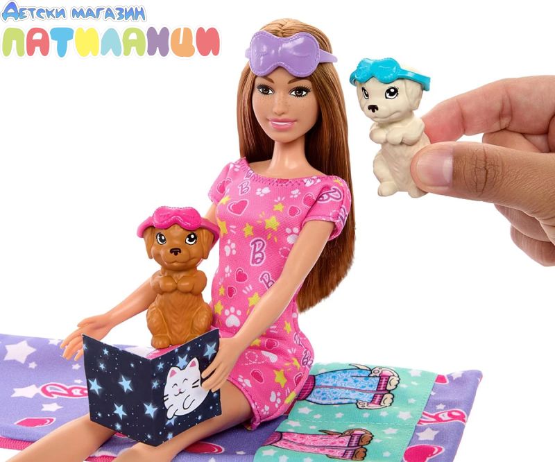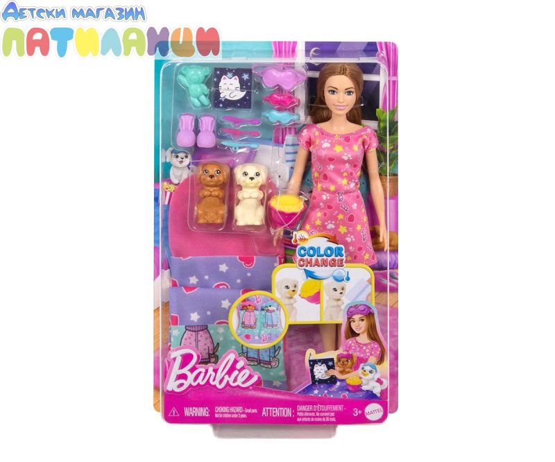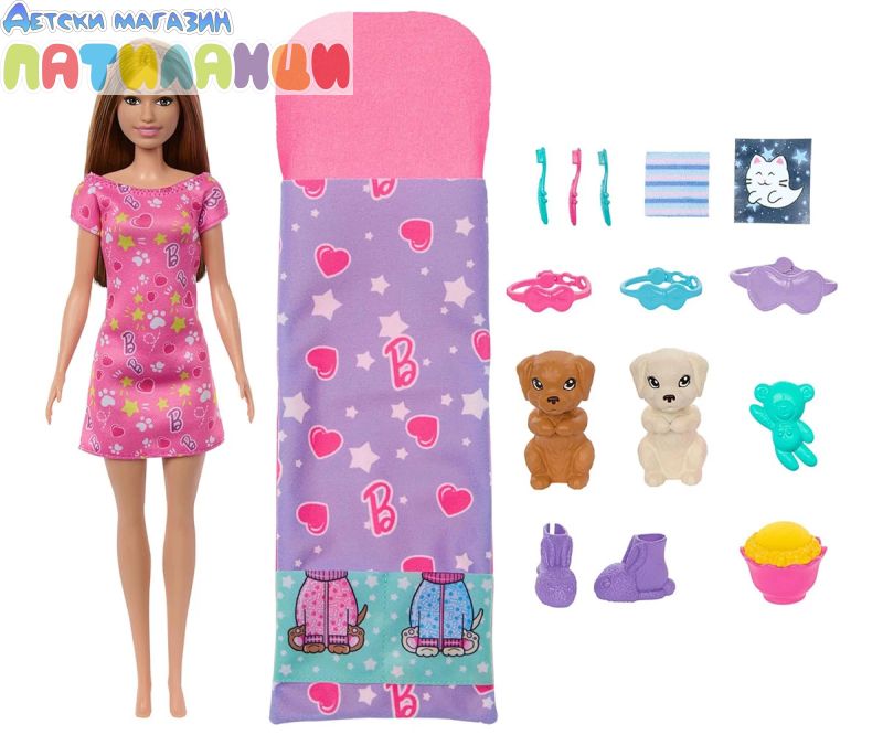 Барби е готова да организира пижамено парти с кученце! Този комплект за игра включва кукла Барби, две очарователни кученца, спален чувал, който пасва и на тримата и 10 аксесоара. За забавление със смяна на цвета, децата могат да трансформират лицето на кученцето от чисто в маслено с помощта на ледено студена и топла вода. Готова за забавна вечер, куклата Барби носи нощница и чехли. Всеки има маска за очи за сладки сънища! Куклата не може да стои сама. Цветовете и декорациите могат да варират.