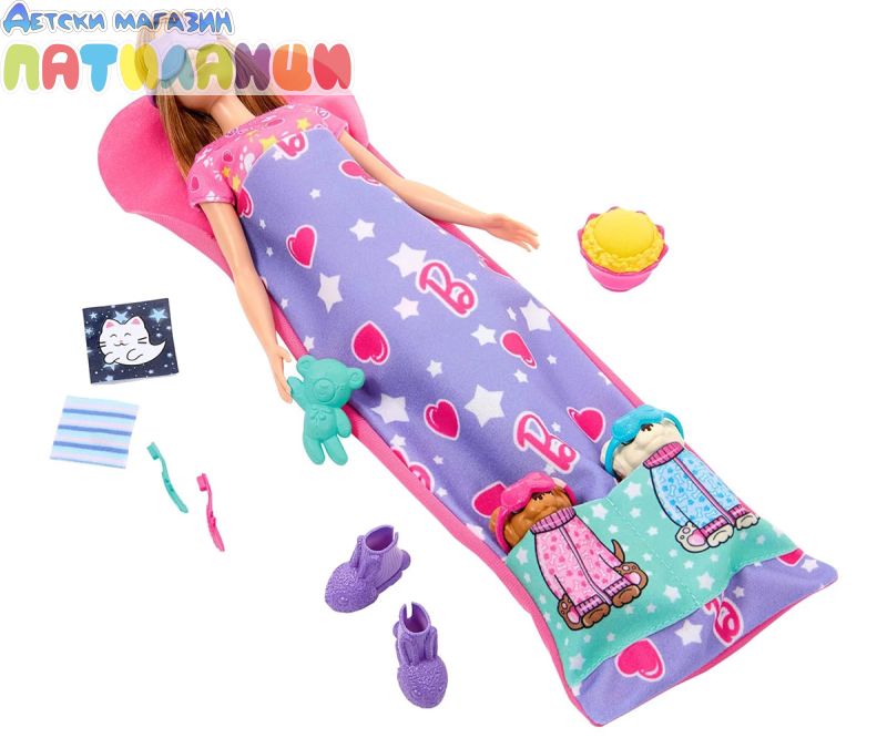 Този комплект има всичко за една забавна нощ, включително кукла Барби, нейните 2 кученца и спален чувал, който пасва и на тримата!