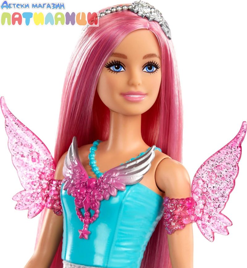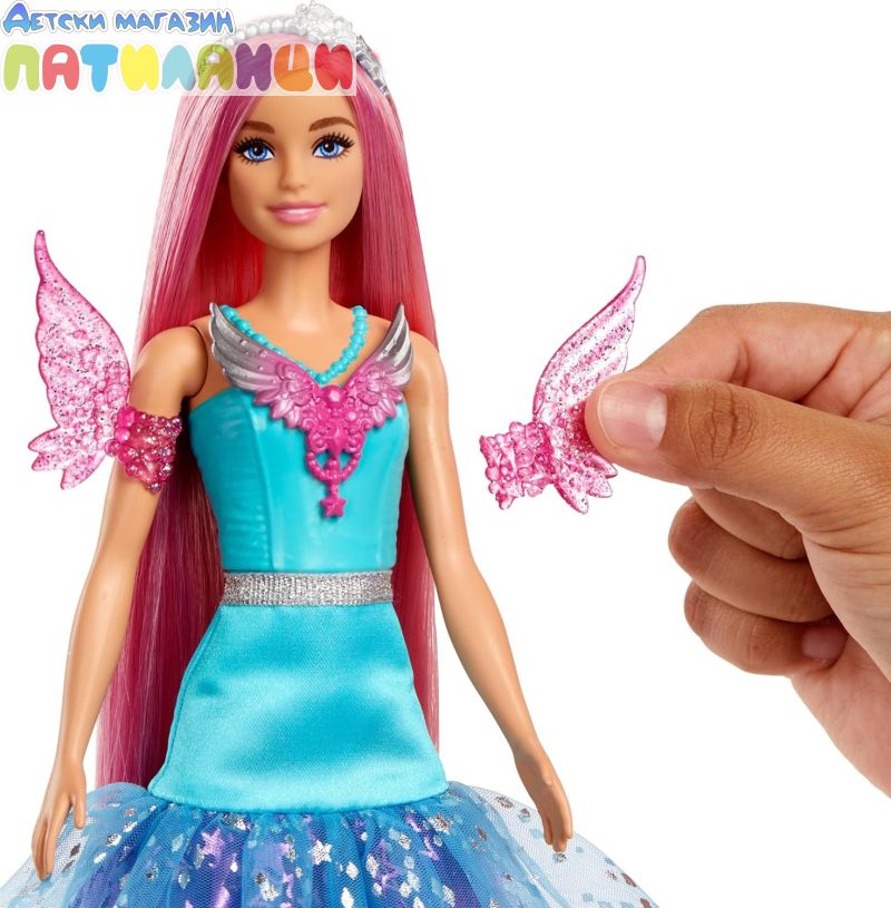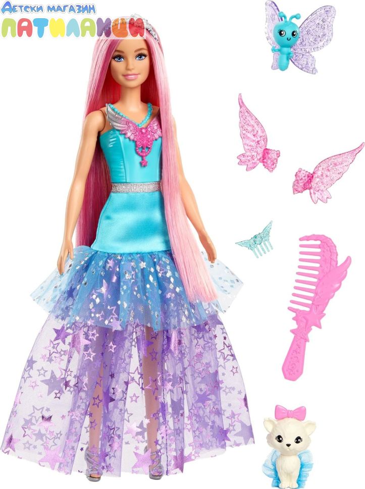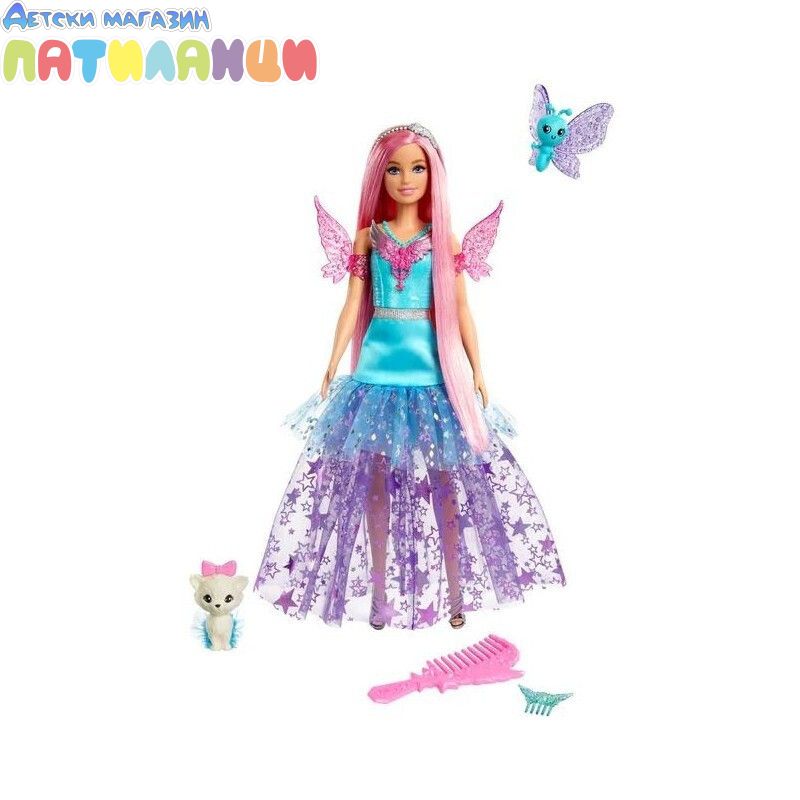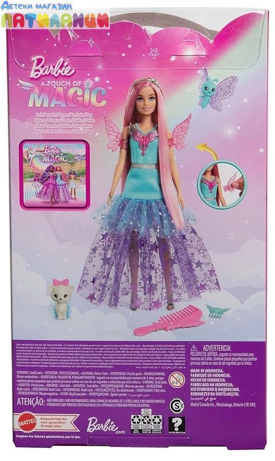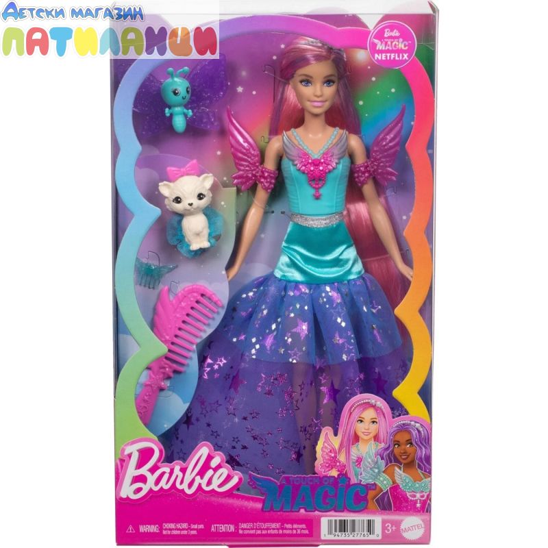 Тоалетът на куклата е вдъхновен от поредицата Barbie A Touch of Magic, a заедно с нея ще получите и два домашни любимеца, както и аксесоари като диадема, гребенче и други.