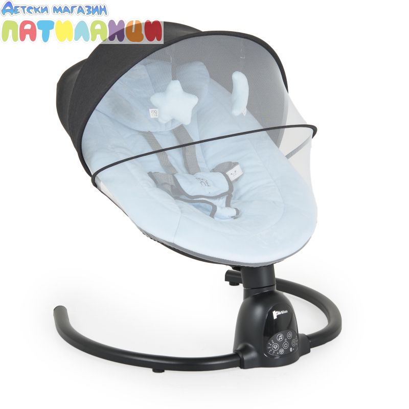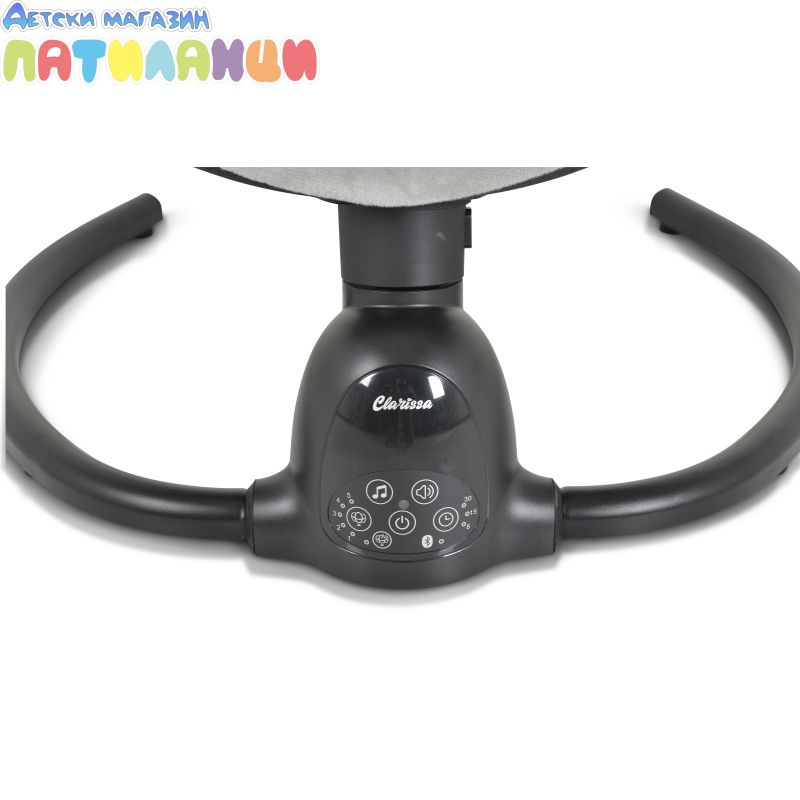 Електрическата люлка Clarissa е със стилен и изчистен дизайн, подходящ за всеки интериор. Скоростите на люлеене, между които можете да избирате, са 5. Люлката има вграден детектор за движение, който може автоматично да активира люлеенето при движение на детето. С помощта на Bluetooth функцията можете да пускате музика по ваше желание, в случай че не искате да се възползвате от наличните 10 мелодии. Люлката работи само с адаптор с дължина на кабела 5м (включен в комплекта). Може да бъде управлявана с тъч панела на механизма или с дистанционно управление. По желание можете да се възползвате от таймера с опция от 8, 15 и 30 минути. С избиране на някоя от тези възможности, люлката спира люлеенето след конкретния интервал от време. 5-точковият предпазен колан ще се погрижи за безопасността на детето. Продуктът разполага със сенник с мрежа против насекоми и 2 плюшени играчки. За комфорта на бебето в комплекта е включена и мека възглавница. Тапицерията може да се сваля лесно, за да се изпере. Люлката може да бъде разглобена бързо и лесно от възрастен чрез едно движение. Освен това, изключително леката й конструкция я прави удобна за пренасяне в друго помещение или за път.