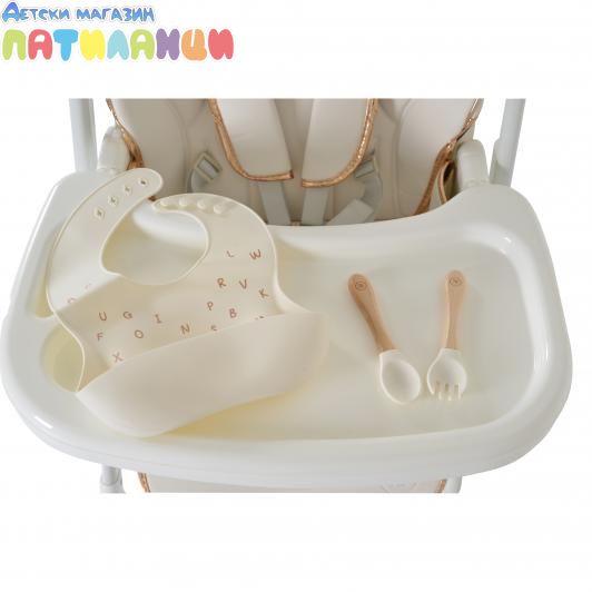 Комплект от столче за хранене, силиконов лигавник, лъжица и вилица.
