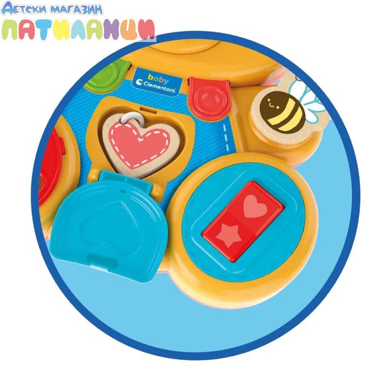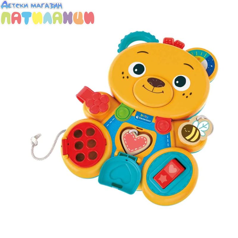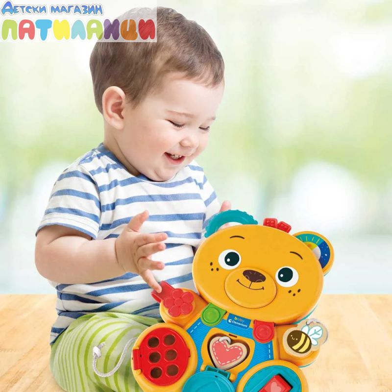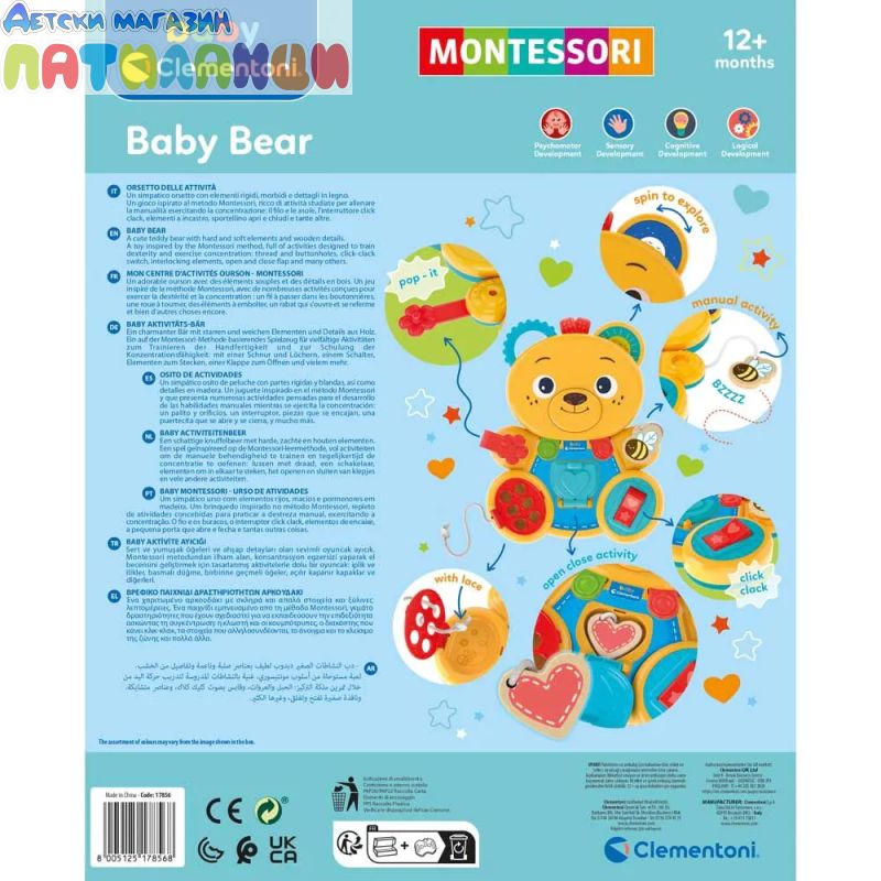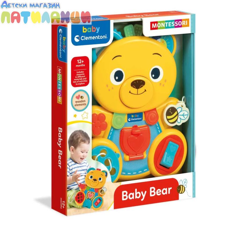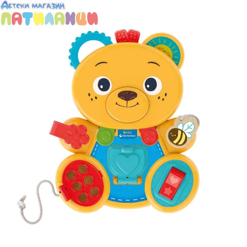 Забавно, сладко мече с много дейности за изследване, направено от много различни материали. Тази играчка използва метода на Монтесори, изпълнен с различни механизми и дейности, предназначени да развият ръчните умения на детето и да подобрят концентрацията му. Използването на различни материали стимулира сетивните способности, насочвайки детето в обучението му да борави с ежедневни предмети. Това е класическа Монтесори концепция, преосмислена с емпатичен дизайн на Baby Clementoni. Тази играчка помага за стимулиране на сетивата на малките деца. С дървени елементи.
