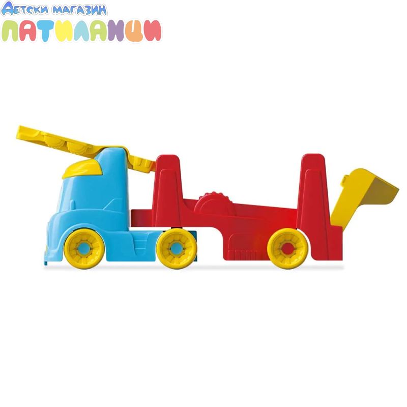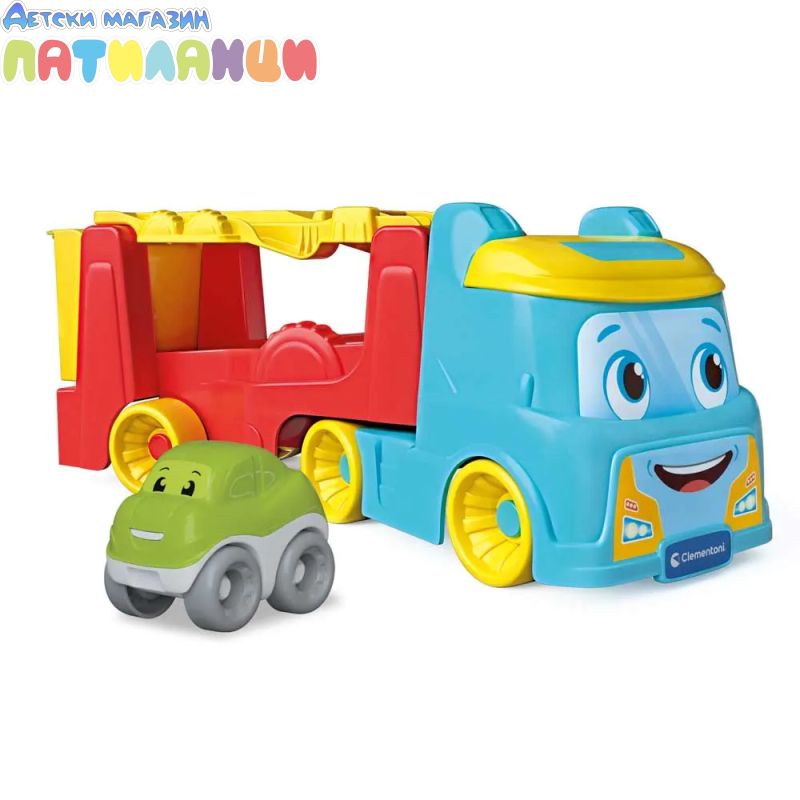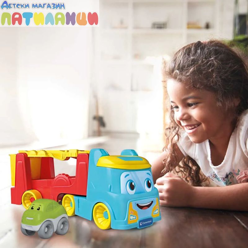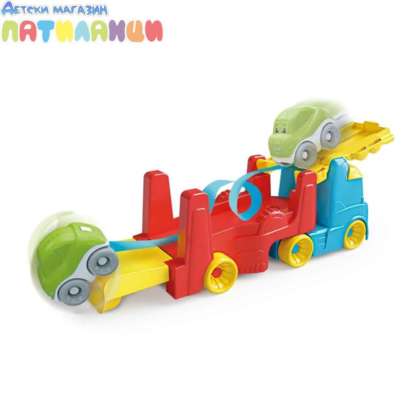 Изключително цветният автовоз на Baby Clementoni разполага с полуремарке за транспортиране на падащи колички.