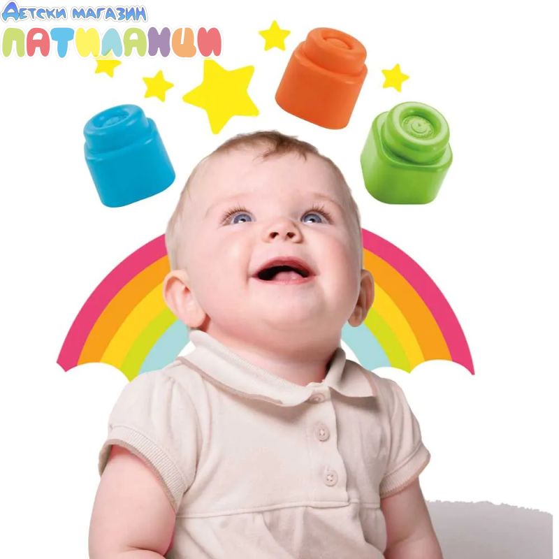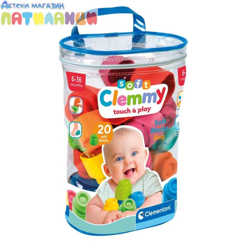 Прозрачният плик съдържа 20 Baby Clemmy меки и цветни форми, предназначени за деца на възраст от 6 до 18 месеца, за да играят в пълна безопасност. Меките Baby Clemmy са идеални за сетивно изследване с много ярки цветове, които стимулират визуалното възприятие, вниманието и уменията за наблюдение. Изработени от нетоксичен, миещ се и ароматизиран материал, те са лесни за хващане и лесно подреждане и подпомагат въображението и креативността на детето.