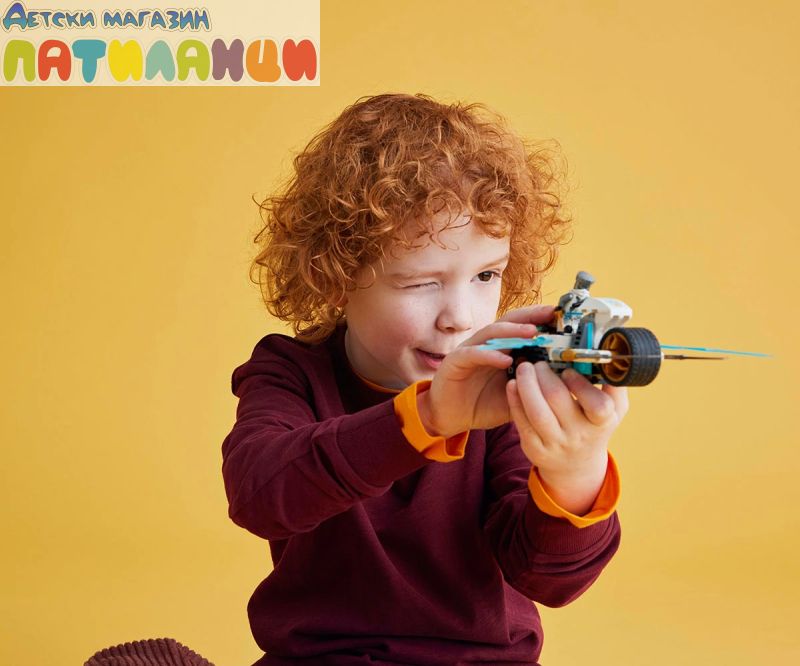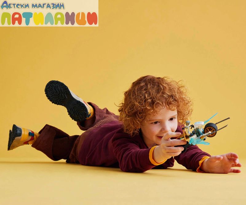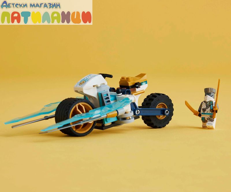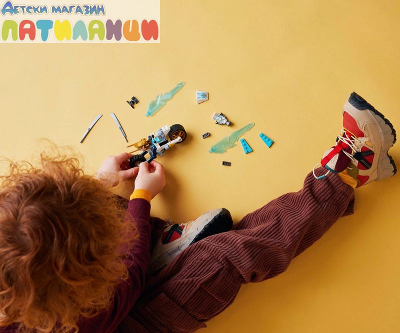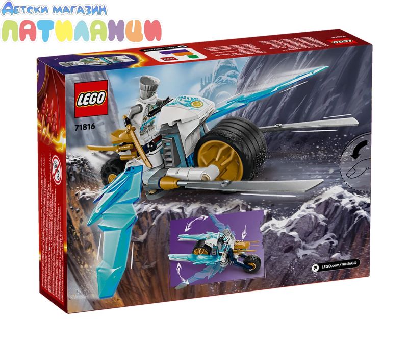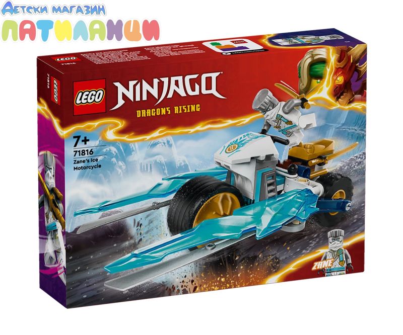 Играчката LEGO® NINJAGO® Леденият мотоциклет на Зейн (71816) позволява на момчета и момичета на възраст 7+ да пресъздават скоростен екшън от сезон 2 на ТВ сериала NINJAGO Dragons Rising. Тази нинджа играчка за деца включва мотоциклет NINJAGO с подвижни колела, златни остриета и окачване на задната гума. Когато децата натиснат гумата, от двете страни се разгъват ледени остриета в режим на атака. Тази впечатляваща приключенска играчка се предлага с минифигура на Зейн, която да се вози на мотоциклета. Зейн е облечен в невижданата досега турнирна броня и държи 2 меча катана за безброй часове разиграване на екшън сцени в света на NINJAGO. Гамата комплекти и екшън играчки за конструиране LEGO NINJAGO включва роботи, дракони и храмове, така че феновете да могат да разиграват екшън сцени. Всеки нинджа комплект за игра може да бъде създаден с приложението LEGO Builder, което направлява вас и вашето дете в лесното и интуитивно строително приключение.