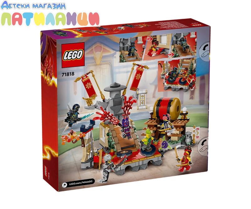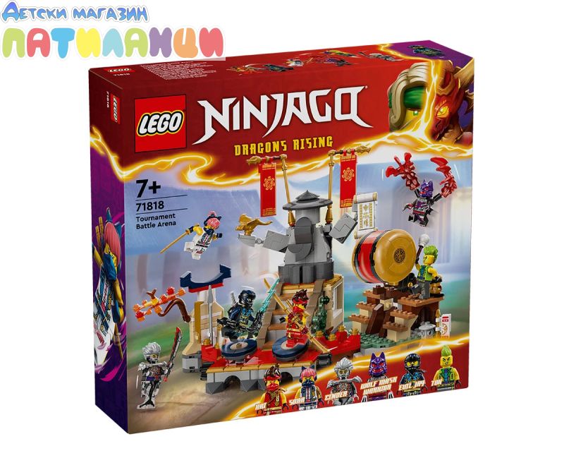 Този детайлен комплект Арена за битки в турнира (71818) позволява на момчета и момичета на възраст 7+ да пресъздадат драматичния финален сблъсък от сезон 2 на ТВ сериала NINJAGO® Dragons Rising. Бойният комплект за игра с нинджи включва много интерактивни функции, за да осигури на децата игри с часове. След това може да бъде привличащ вниманието модел, изложен на рафта или нощното шкафче. Този комплект LEGO® NINJAGO включва 2 подвижни платформи, така че децата да могат да разиграват вълнуващи битки с нинджа и злодей, голям барабан, който могат да избутат от стойката му, за да се търкаля на арената, и стълбище, което се срутва с натискането на лост и всички герои върху него се плъзват към дъното. Тази нинджа играчка за конструиране за деца се предлага с 6 минифигури NINJAGO. Нинджа Кай и Сора в техните турнирни доспехи и с невиждани досега къси мечове катана се бият с колекция от злодеи: Синдър, Воин с маска на вълк и, ексклузивно в този комплект, Злия Джей и Токс.