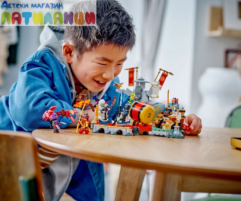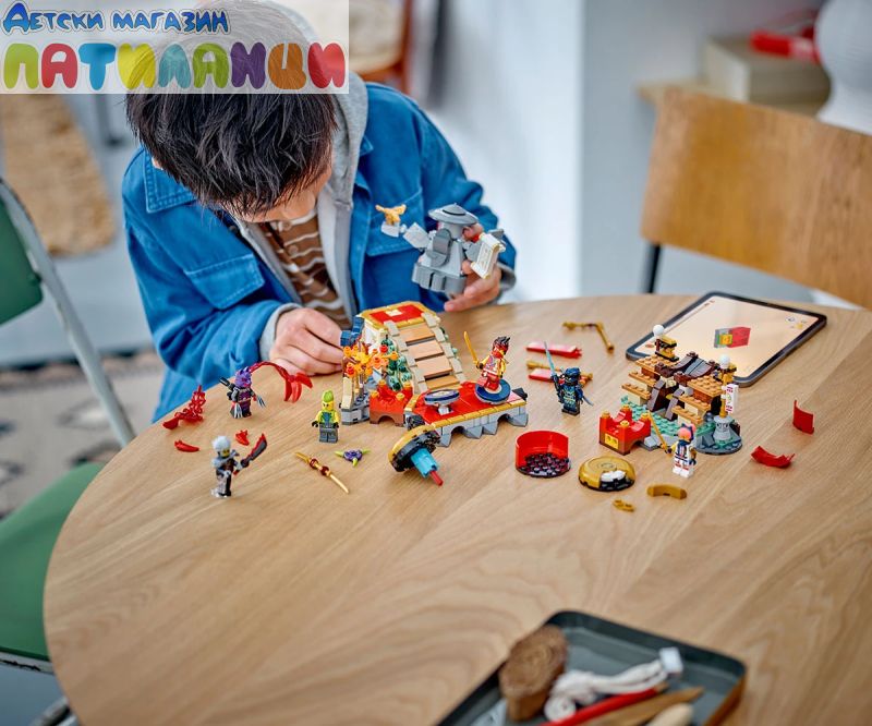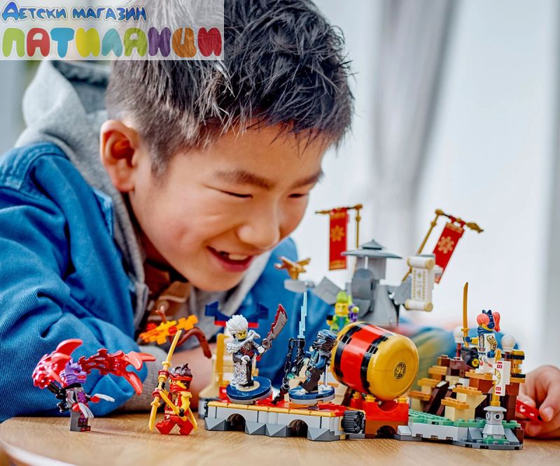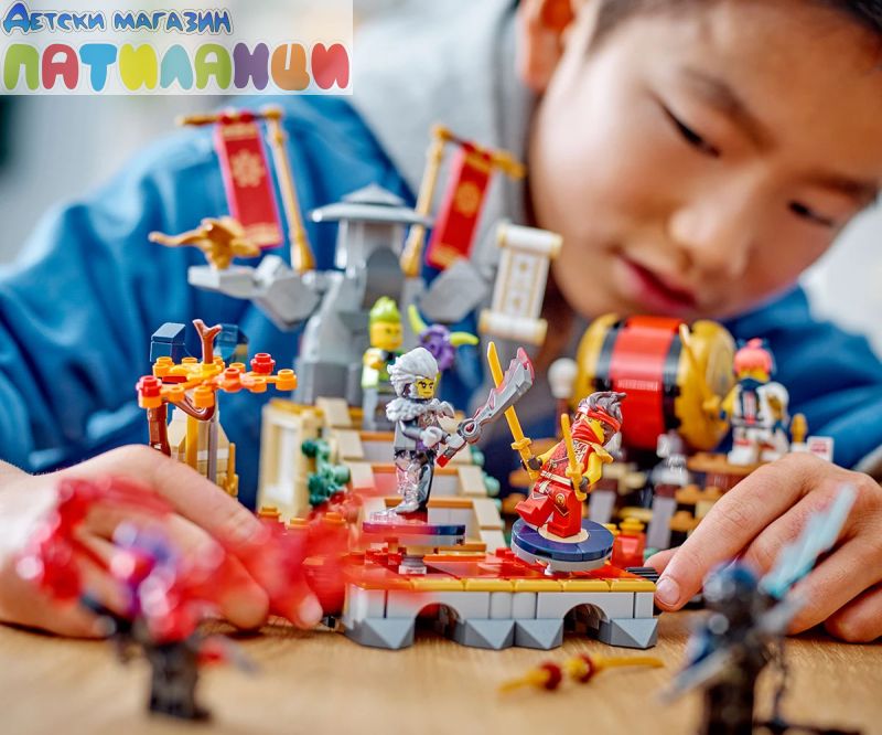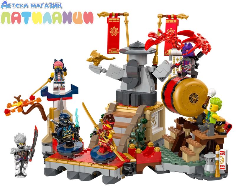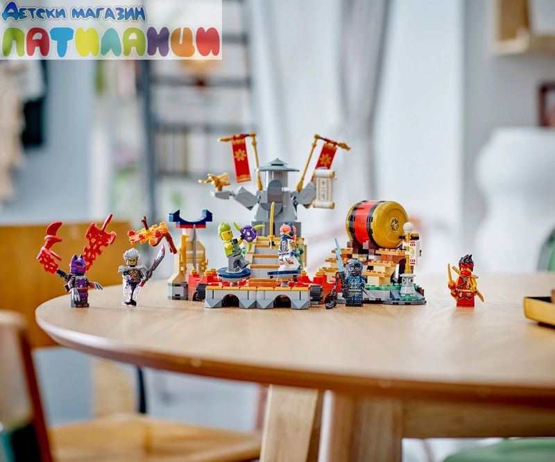 Комплект за игра с нинджи LEGO® NINJAGO® Арена за битки в турнира с 6 минифигури NINJAGO, с които децата да разиграват бойни сцени с много екшън.
