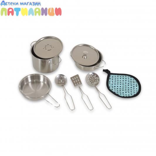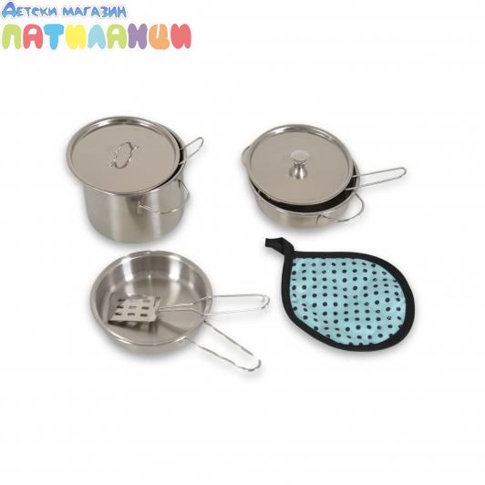 Комплектът включва:Голяма тенджерка с капак, малка тенджерка с капак, тиган, две решетъчни лъжици, черпак и меко текстилно протекторче за топли съдове;