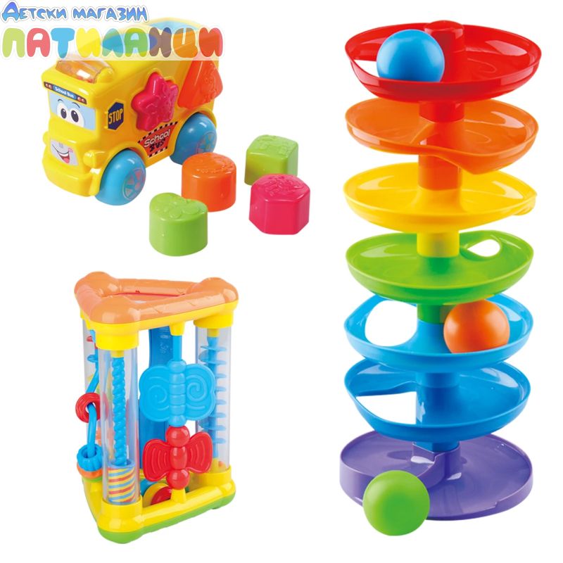 Съдържание: 3 топчета, писта кула, сортер и сметало.