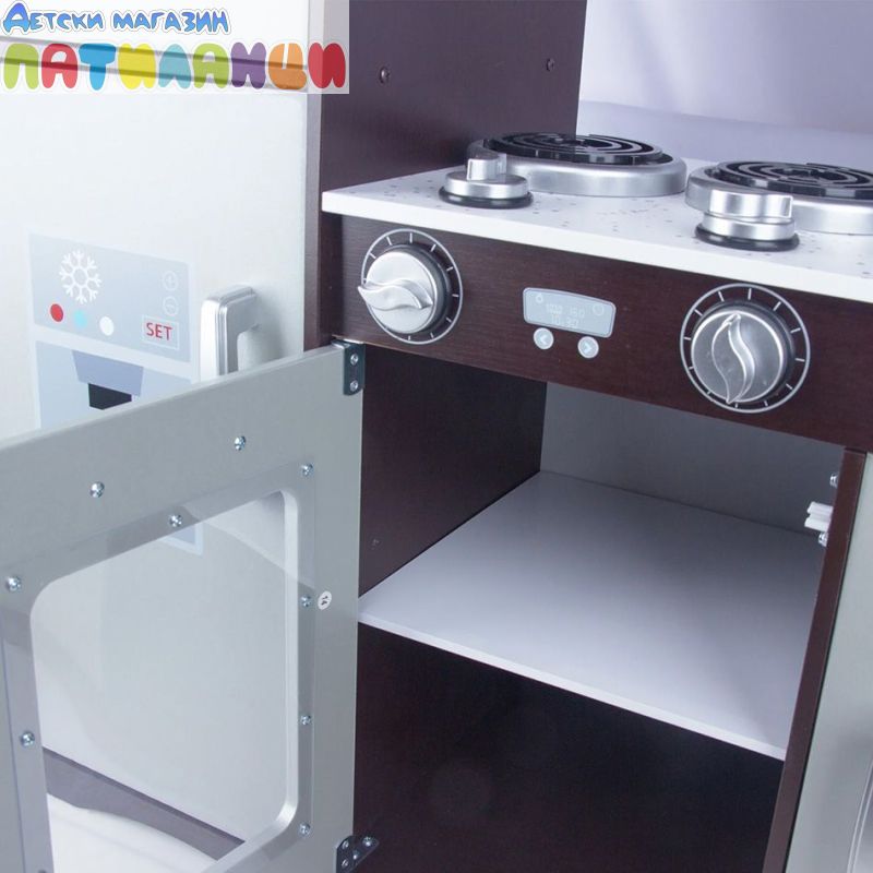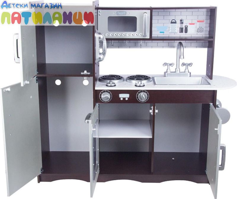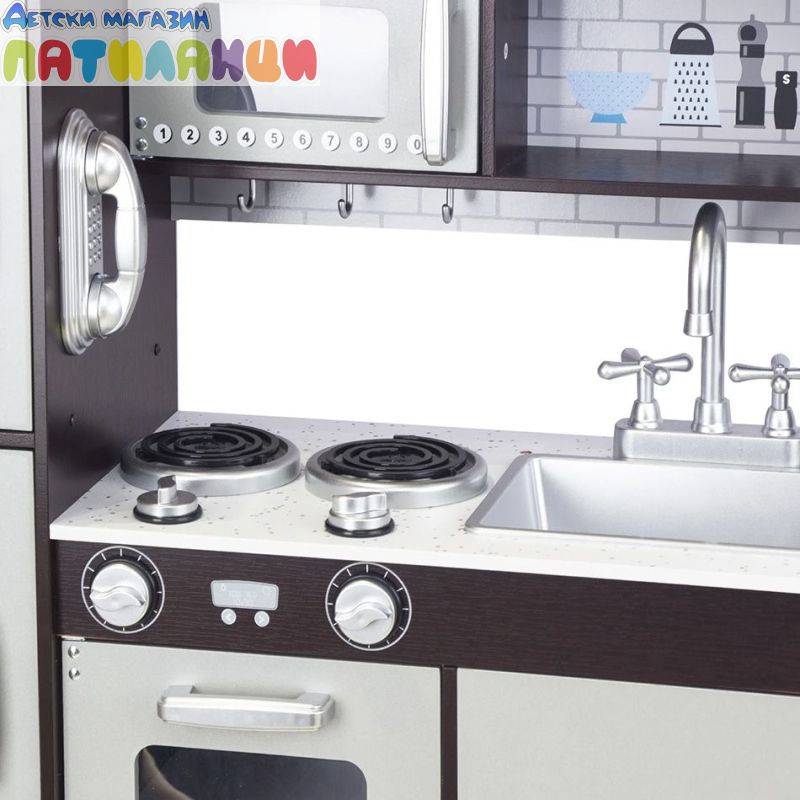 Тази детска кухня играчка позволява на децата да разберат и изпитат почти всички уреди в съвременната кухня, включително хладилник, микровълнова фурна, хладилник и печка. Рафтовете и стелажите над печката в този детски кухненски комплект са просторни, а печката с щракващи копчета и хромиран кран с въртящи се дръжки изглежда невероятно реалистично.