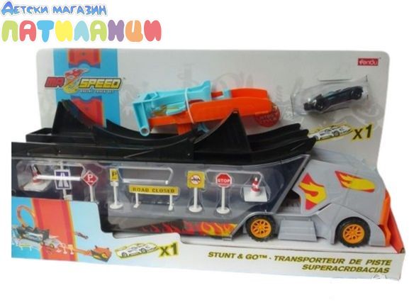 Камиона се превръща в писта като кабината е подвижна и се разтяга напред, като удължение на пистата. Пистата се сглобява по показания начин и количката се пуска с изтрелвачка,която се монтира в задната част.Количката прави лупинг по пистата и скача в удължената писта.Може да се използват допълнителни колички със същите размери и форма.В комплекта има налични пътни знаци.