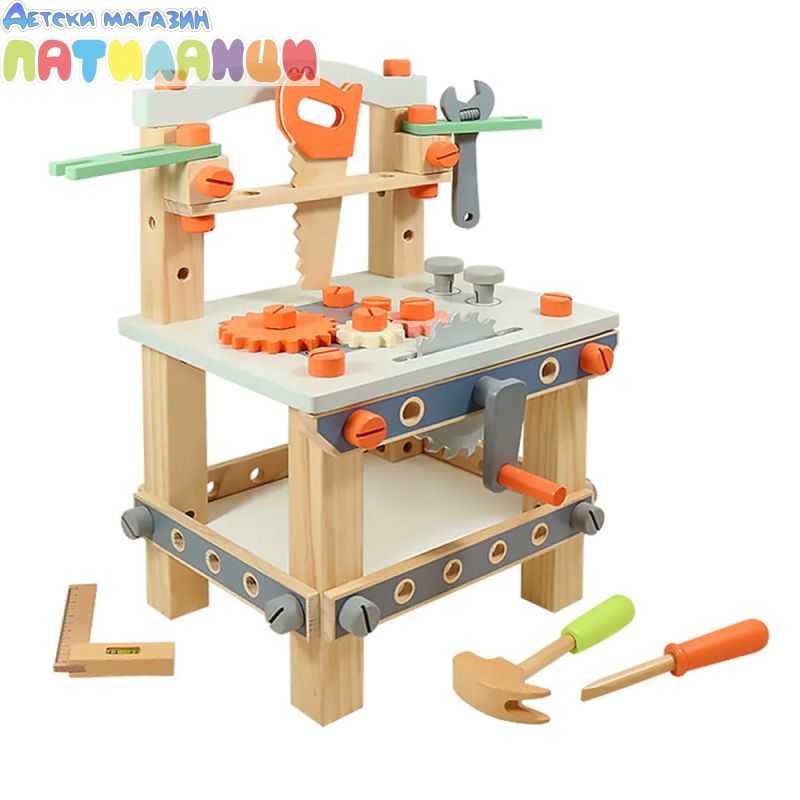 Детска дървена работна маса и комплект инструменти - ученето чрез игра помага за развитието на фините двигателни умения и насърчава разбирането на принципите на STEAM за наука, технологии, инженерство, изкуства и математика. Перфектният комплект дървена работилница, богато оборудвана с множество инструменти, на които много майстори могат да завидят. Включва гаечен ключ, линийка, чук, отвертка и много винтове и дървени части за упражняване на строителни умения. Приготви се да строиш, деконструираш и строиш отново. С тази удобна маса можеш да се почувтваш като истински майстор и да чукваш, измерваш и затягаш винтове и различни дървени части.