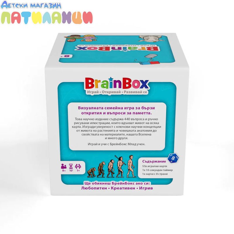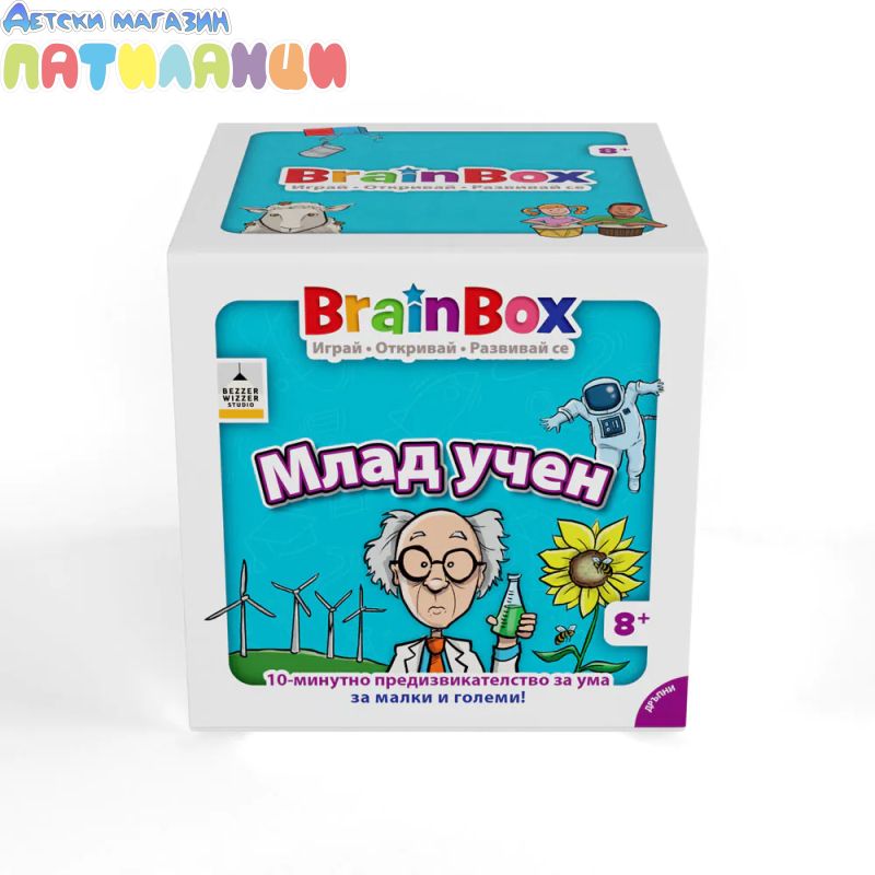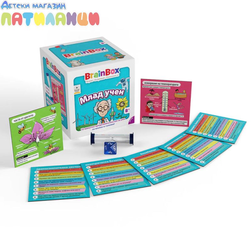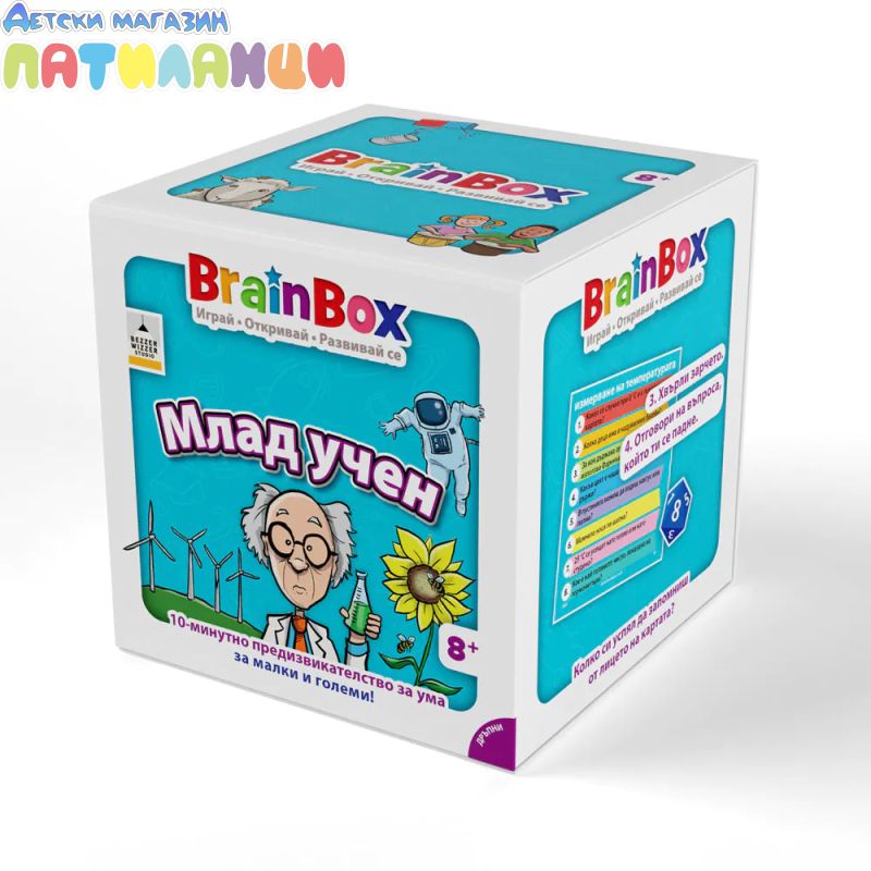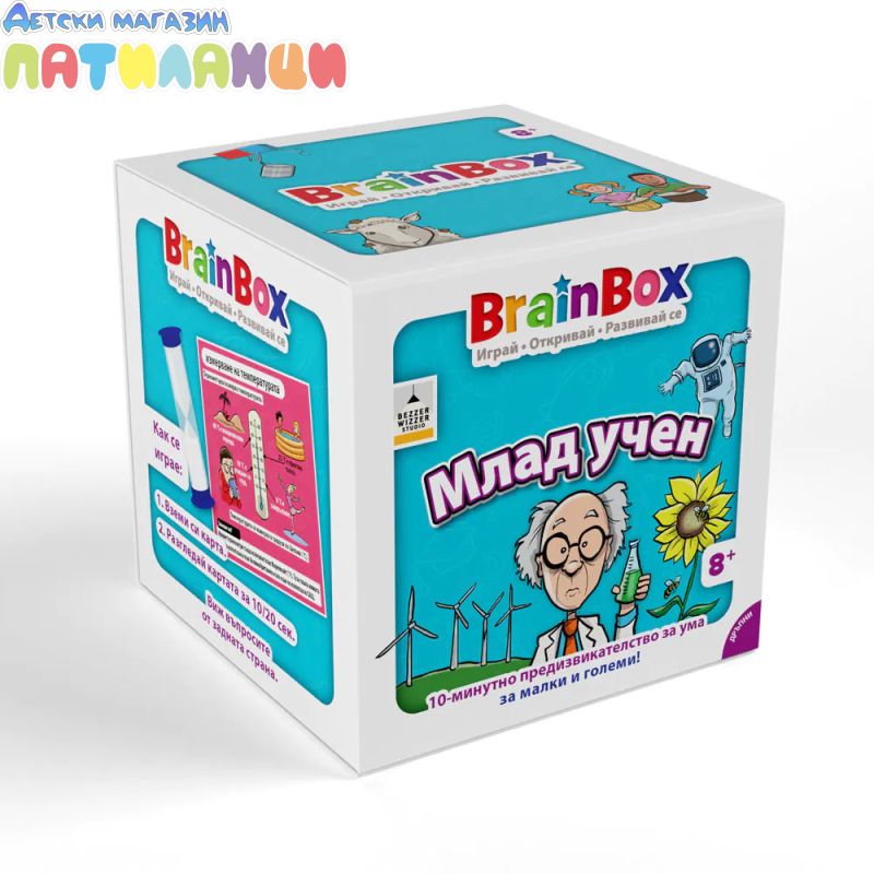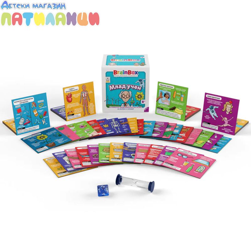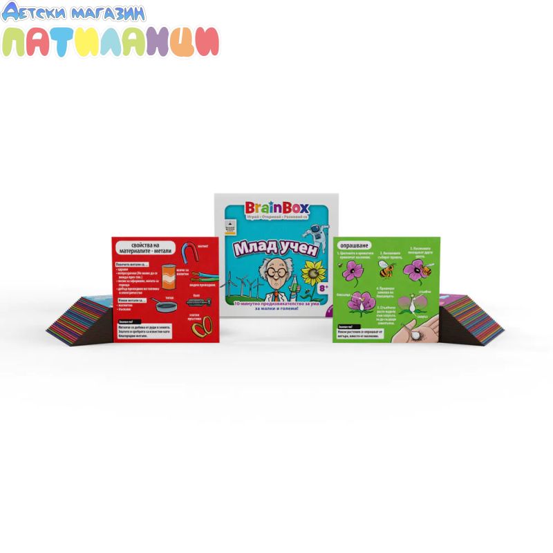 BrainBox МЛАД УЧЕН съдържа 55 игрални карти, представящи различни научни концепции от живота на растенията и човека и интересни факти за материалите и Вселената около нас. Всяка карта съдържа ръчно рисувани илюстрации, вдъхващи живот на всяка карта.