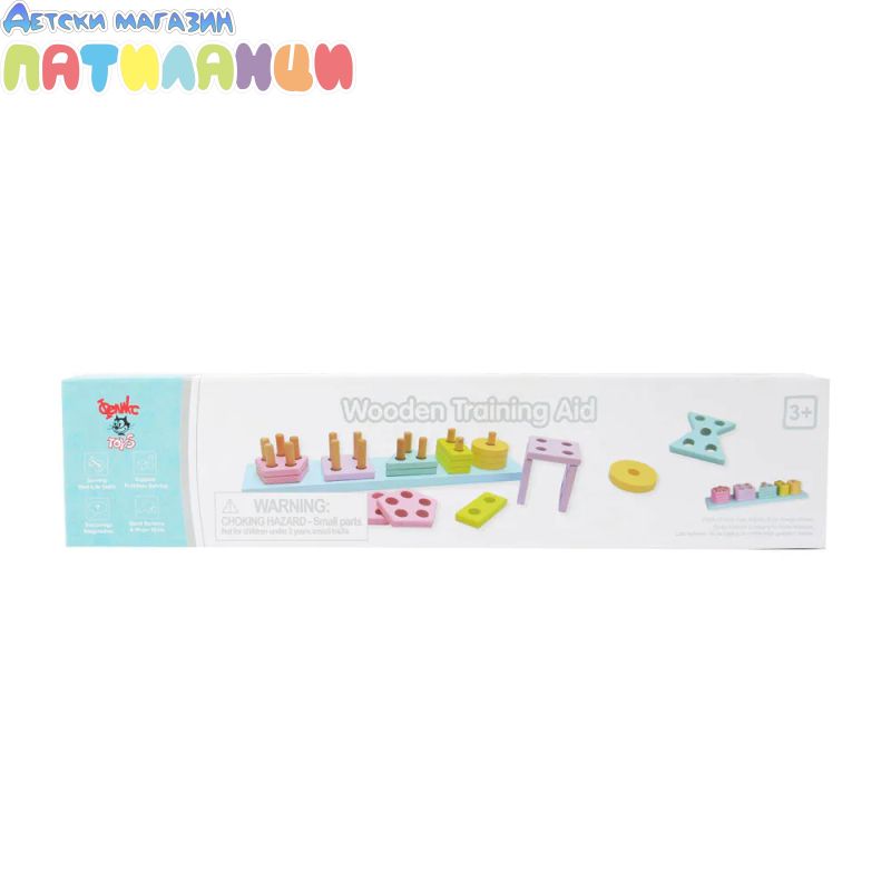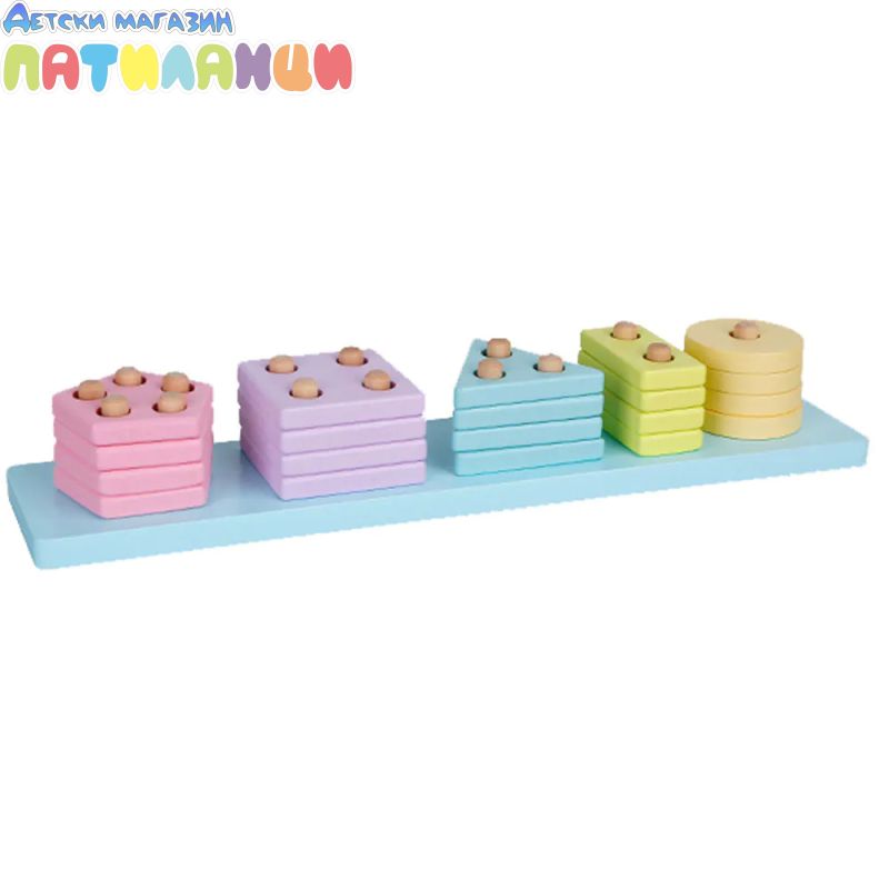 Тази дървена низанка има 5 геометрични форми с различни шаблони в различни цветове, с което помага на децата да учат формите, цветовете и да броят.