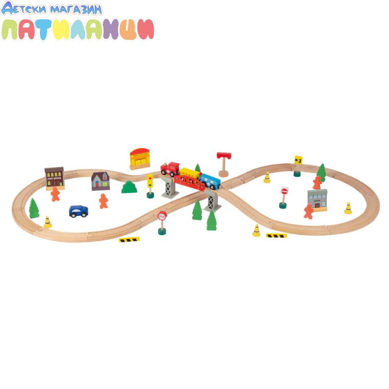 Идва с разнообразие от цветни влакове, железопътни релси, сгради, дървета и други аксесоари. Гладките ръбове и издръжливият дизайн го правят идеален за малките ръчички, които да изследват и да се наслаждават.