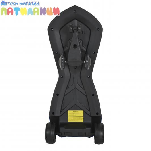 Автомобилът разполага с бутон, който активира впечатляващи предни светлини и реалистични звукови ефекти, създавайки усещане за истинско шофиране. Удобната поставка за крачета позволява децата да се насладят на комфорта по време на игра, а маневрените предни колела с LED светлини правят управлението лесно и забавно.