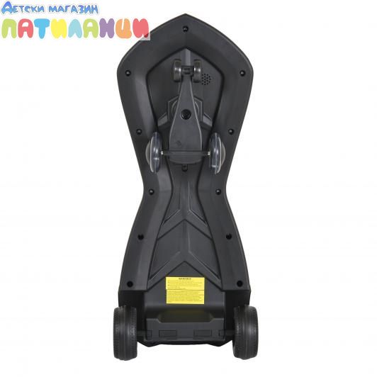 Автомобилът разполага с бутон, който активира впечатляващи предни светлини и реалистични звукови ефекти, създавайки усещане за истинско шофиране. Удобната поставка за крачета позволява децата да се насладят на комфорта по време на игра, а маневрените предни колела с LED светлини правят управлението лесно и забавно.