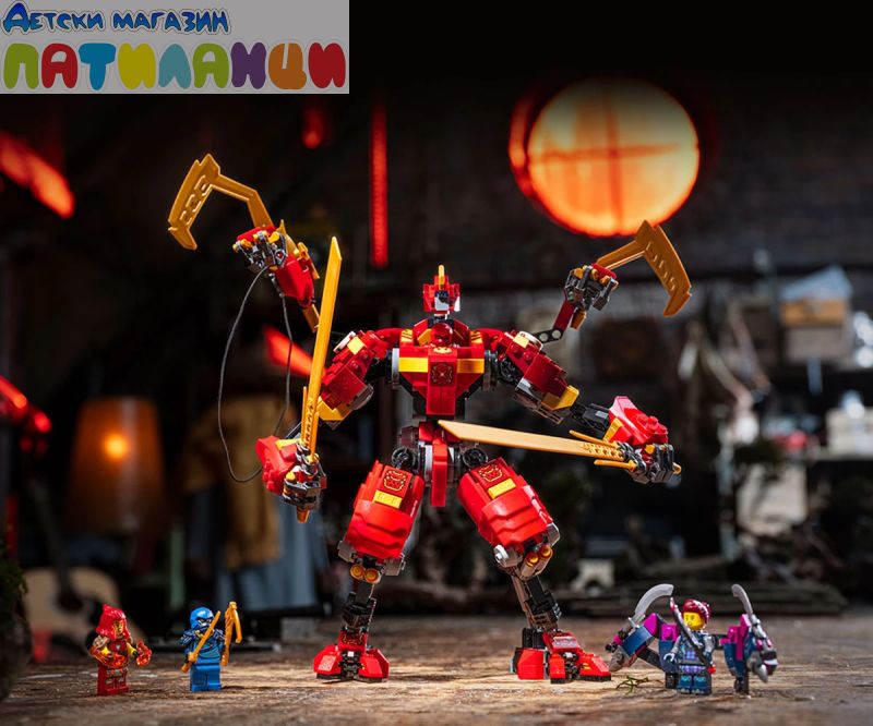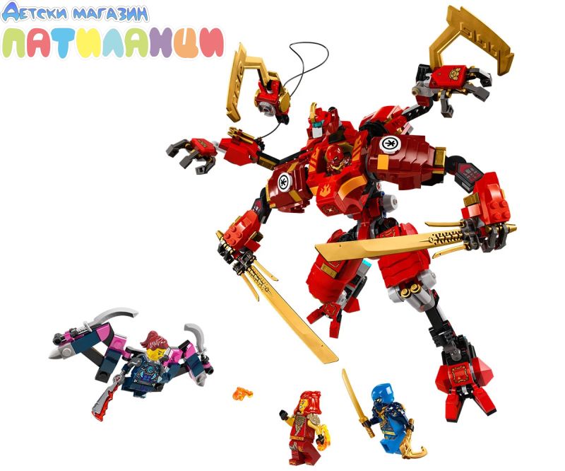 Комплектът за игра LEGO® NINJAGO® Нинджа робот катерач на Кай позволява на децата да организират приключения с подвижна фигура на робот и 4 минифигури на герои от NINJAGO.