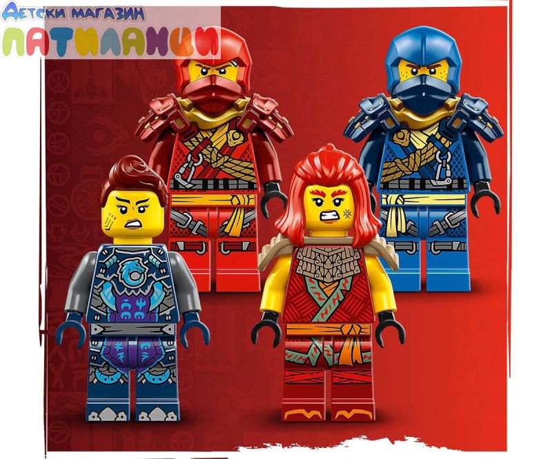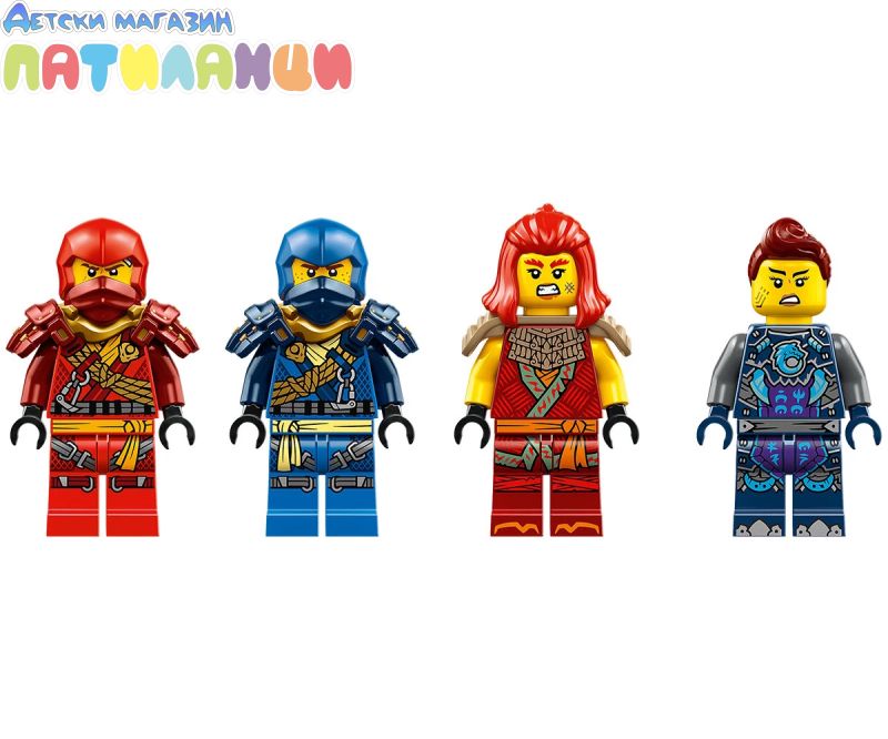 4 минифигури от NINJAGO® – нинджа играчката включва Кай катерач и Джей катерач с катани, Уайлдфайър с 2 пламтящи юмрука и Джордана с планер;