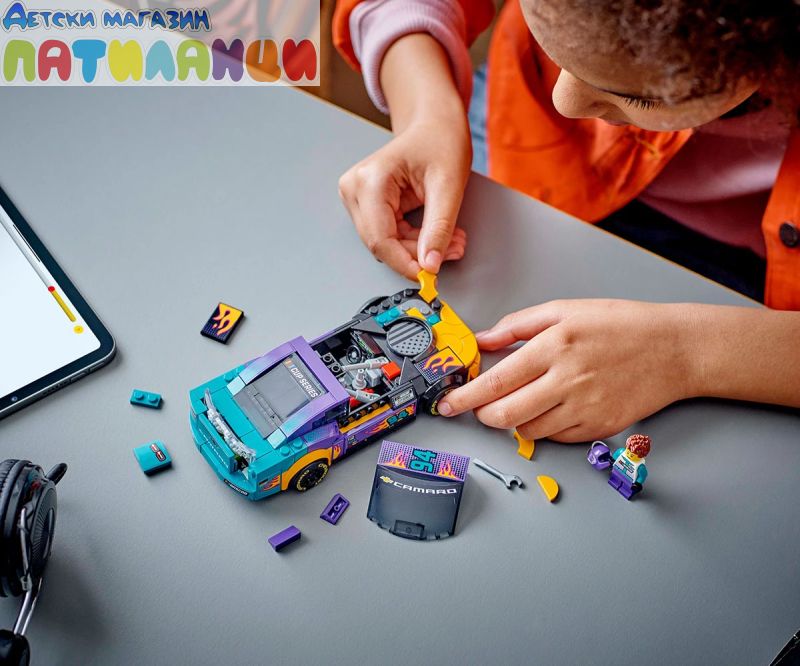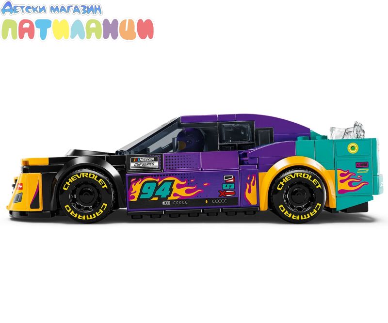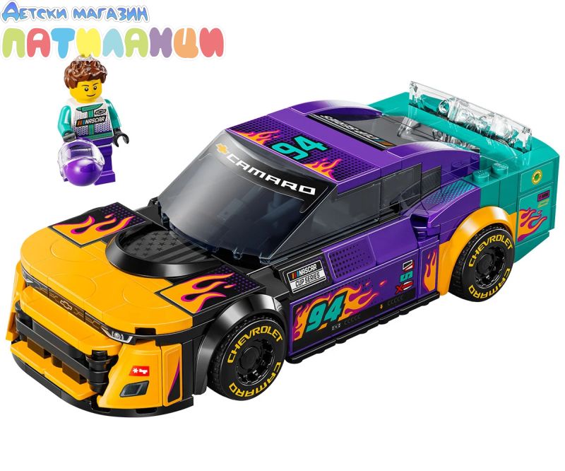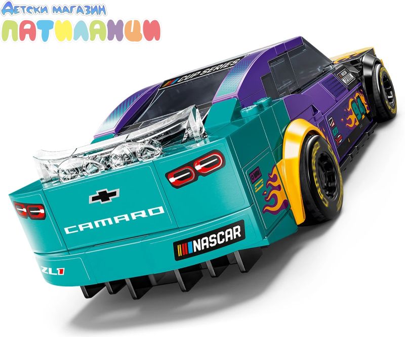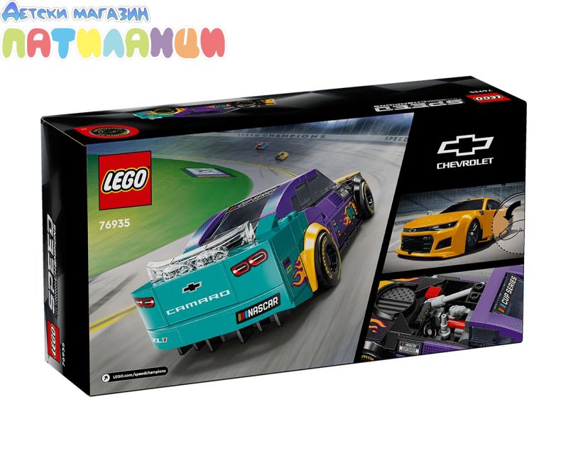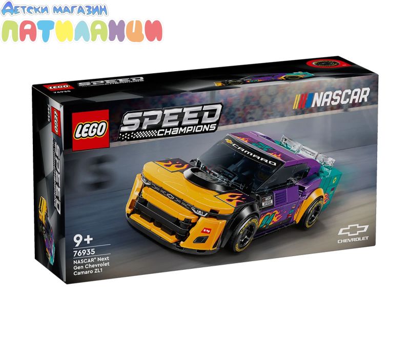 Момчетата и момичетата на възраст 9+ години и феновете на NASCAR® могат да колекционират, построяват, играят и показват колата LEGO® Speed Champions NASCAR Next Gen Chevrolet Camaro ZL1 (76935) за деца. Този мощен състезателен автомобил, украсен вярки цветове и пламъци, включва дизайнерски детайли от реални автомобили, които се състезават в NASCAR Cup Series. Моделът на кола от NASCAR включва реалистични елементи, като задния спойлер, предната решетка, капака, фаровете и колелата, интериор с пр едпазна клетка, табло, скоростен лост и пожарогасител и автентично лого на Camaro, Cup Series и NASCAR. Комплектът със състезателна кола включва и минифигура на пилот от NASCAR, която децата могат да поставят зад волана, за да разиграват вълнуващисъстезания. Колите LEGO Speed Champions позволяват на деца и страстни фенове на автомобили да създават висококачествени реплики на някои от най-емблематичните автомобили в света. Всяка кола може да бъде построена с помощта на инструкции на хартия или п риложението LEGO Builder, което насочва вас и вашето дете по време на лесно и интуитивно строително приключение.