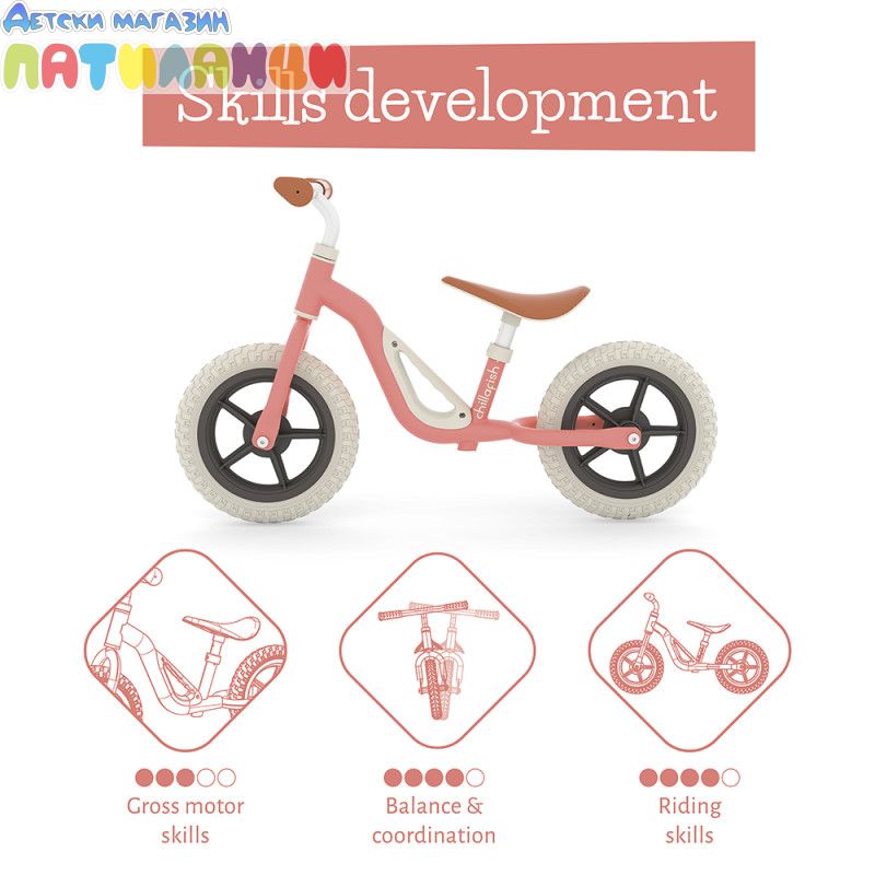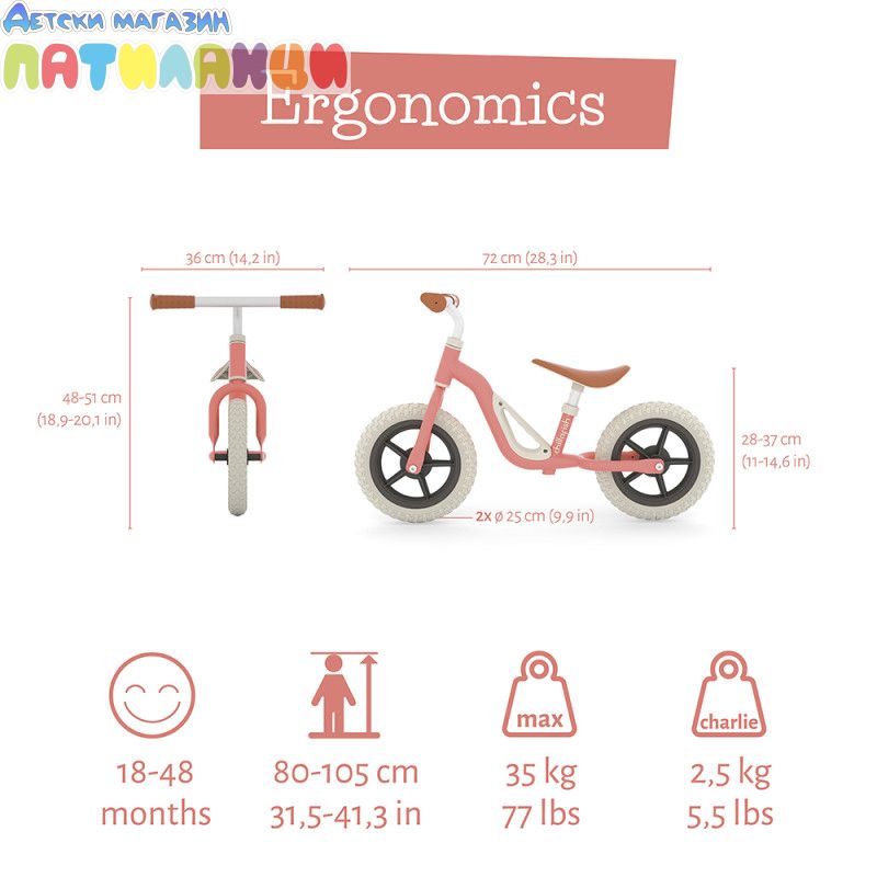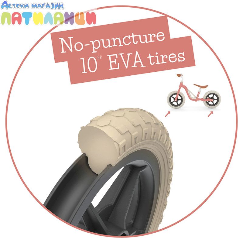 Charlie е класическо 10-инчово колело за баланс с интегрирана дръжка за носене. То е изключително леко и маневрено. Свежият дизайн, регулируемата височина на седалката и кормилото го прави лесно адаптивно към растящото дете. В допълнение 10" гуми от EVA пяна, гарантират, че няма да има неприятни изненади по време на разходка! Няма да има нужда от помпане или смяна. Те практически издържат “цял живот”.