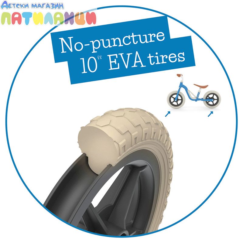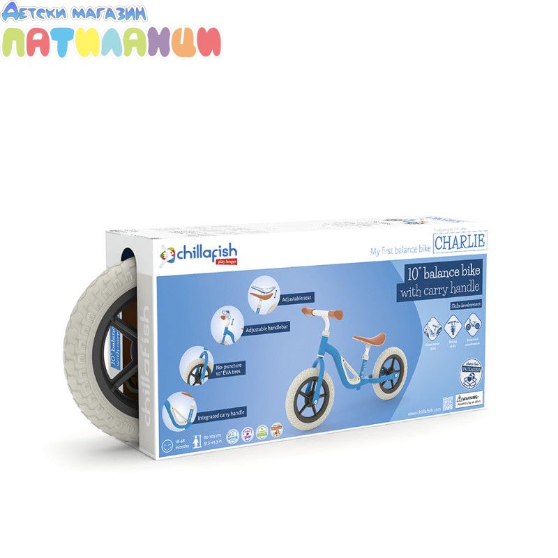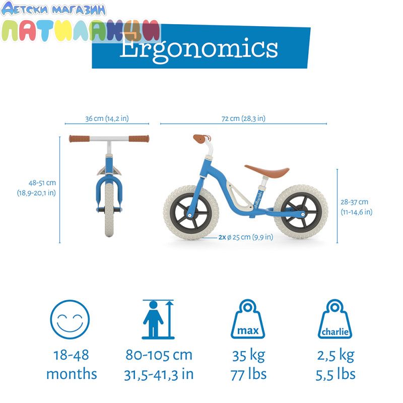 Charlie е класическо 10-инчово колело за баланс с интегрирана дръжка за носене. То е изключително леко и маневрено. Свежият дизайн, регулируемата височина на седалката и кормилото го прави лесно адаптивно към растящото дете. В допълнение 10" гуми от EVA пяна, гарантират, че няма да има неприятни изненади по време на разходка! Няма да има нужда от помпане или смяна. Те практически издържат “цял живот”.