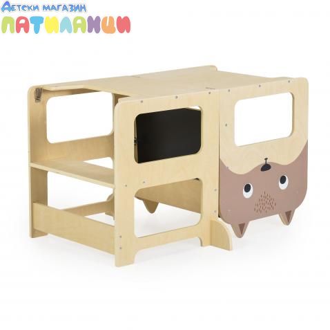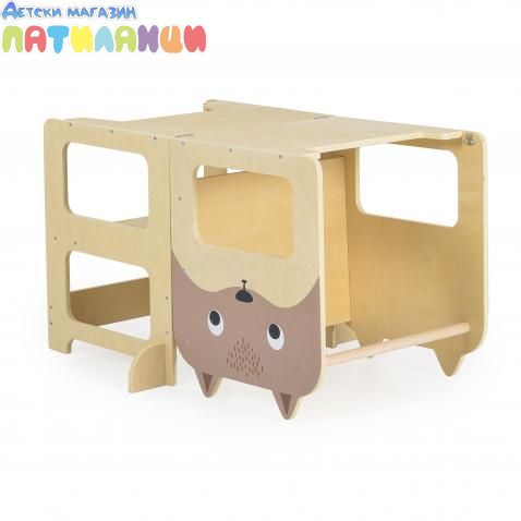 - Кулата може лесно да се трансформира в малка маса със столче, където детето може да рисува, да играе, да яде или да извършва други творчески занимания. Това е идеално за занимания, изискващи по-ниска повърхност и спокойна среда.