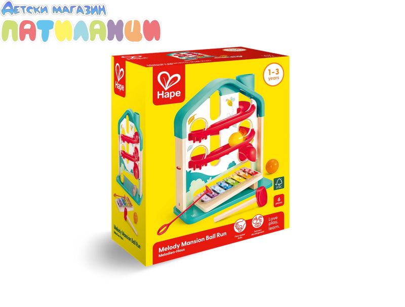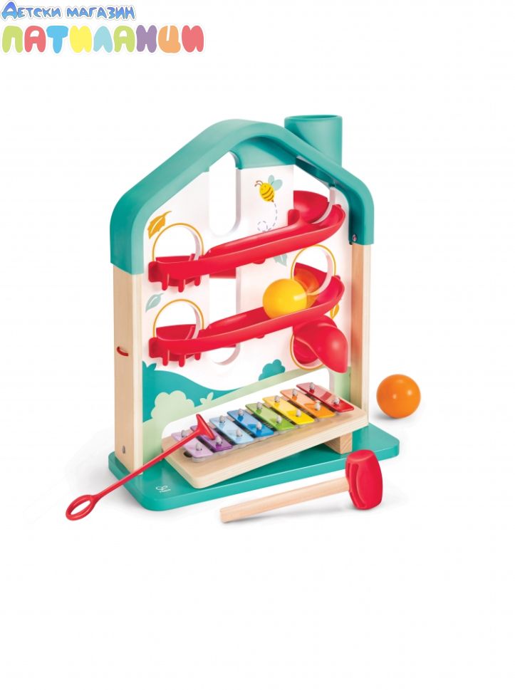 Пъхнете в коминчето цветната топка, а с помоща на малкото чукче помогнете топчето да извърви пътя, когато стигне до края ще чуете красивите мелидии на ксилофона.