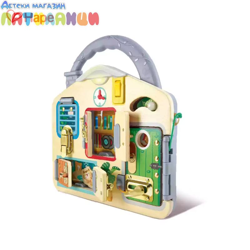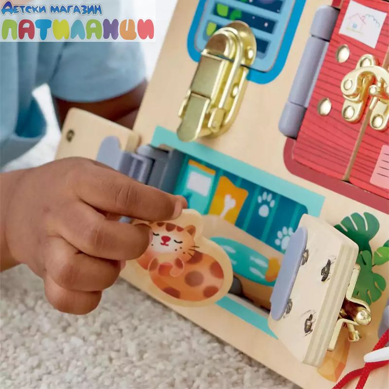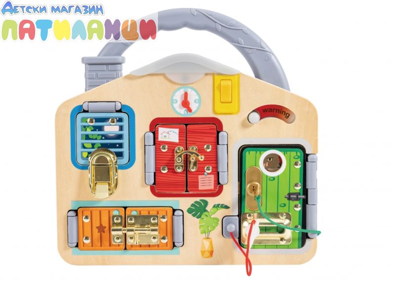 Развитие на фината моторика: Дъската включва различни ключалки, които изискват прецизни движения и сръчност, помагайки на децата да развият координацията и уменията си за работа с ръцете.