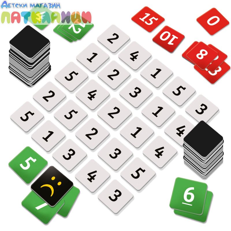 Комплектът на играта съдържа: 25 броя плочки с числа; 23 зелени плочки за цел; 23 червени плочки за цел; 1 плочка за грешка; правила за игра.